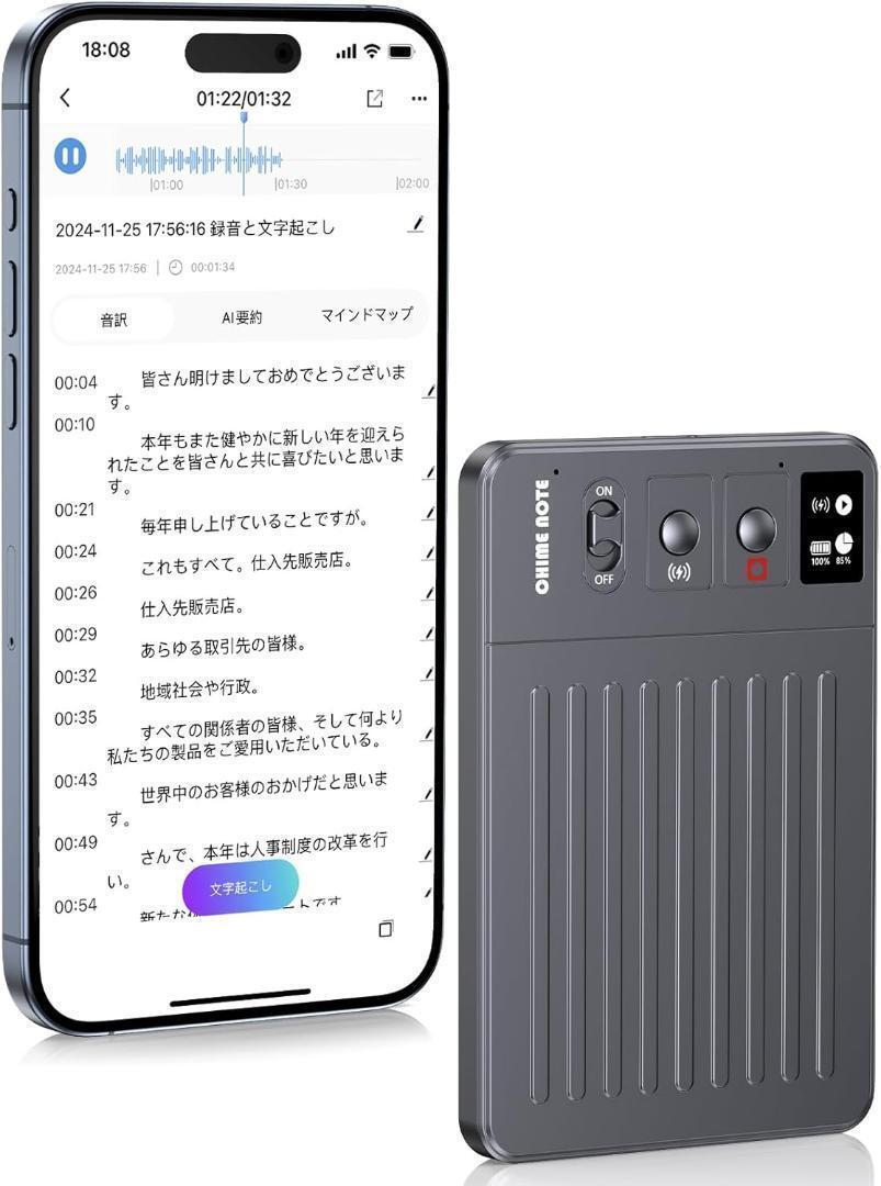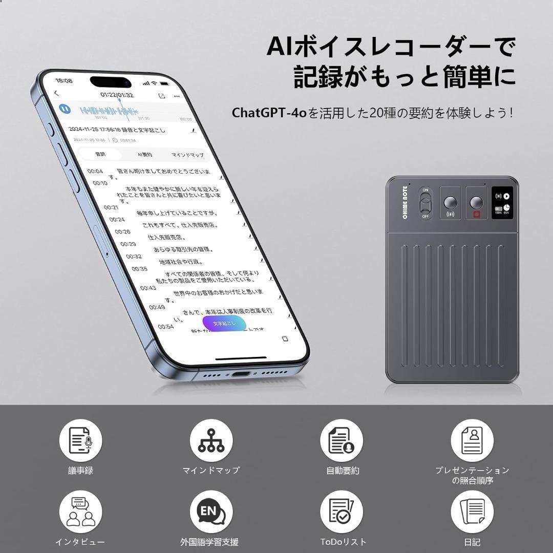 GPT-4を採用したCHIME NOTE PRO AI ボイスレコーダーは、107カ国語に対応し、音声データを瞬時に高精度で文字起こしします。別途料金がかからない。誤字や変換ミスを最小限に抑え、アプリで確認・編集が可能です。30種の形式で内容を要約することができます。