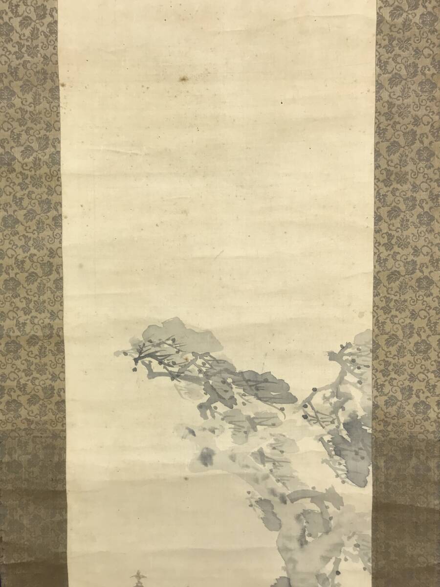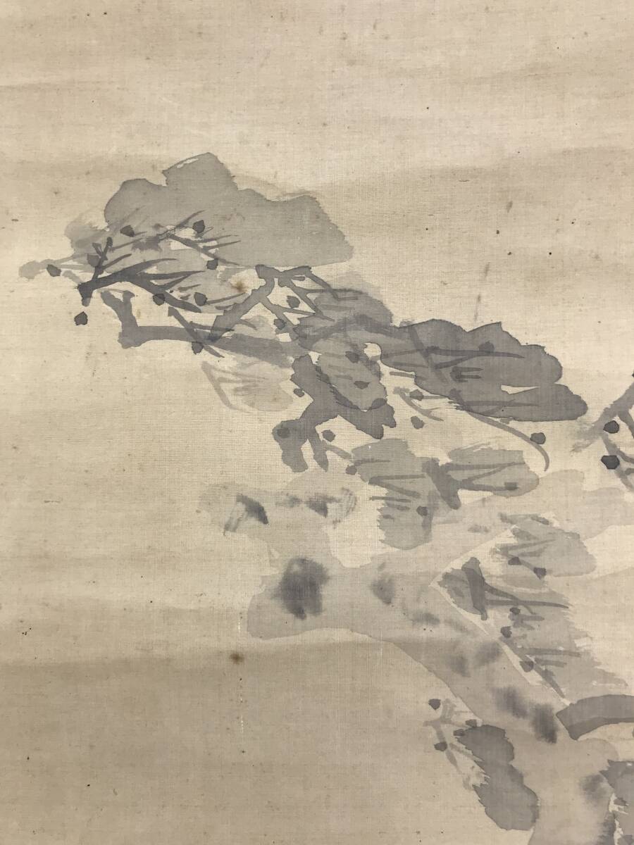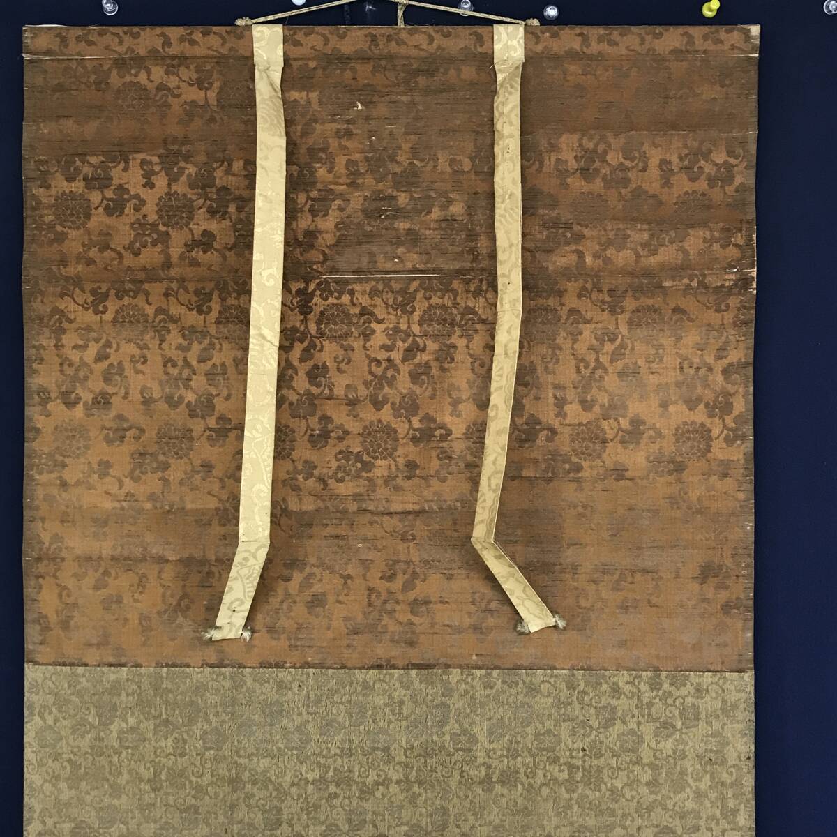【作品状態】 本紙は絹本肉筆です。本紙は薄汚れ、多少の汚れシミ、折れ、巻シワあります。表装は時代感あり、薄汚れ、汚れシミ、全体に多数の割れ、ホツレ、巻シワあります。