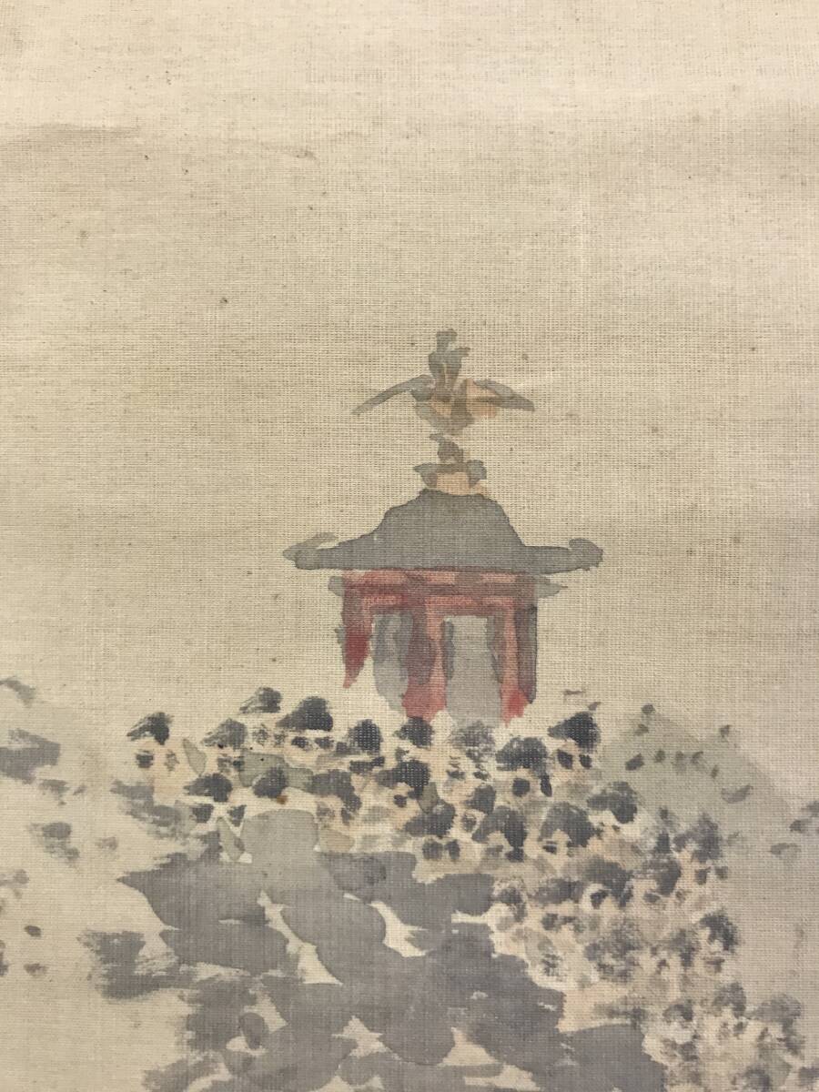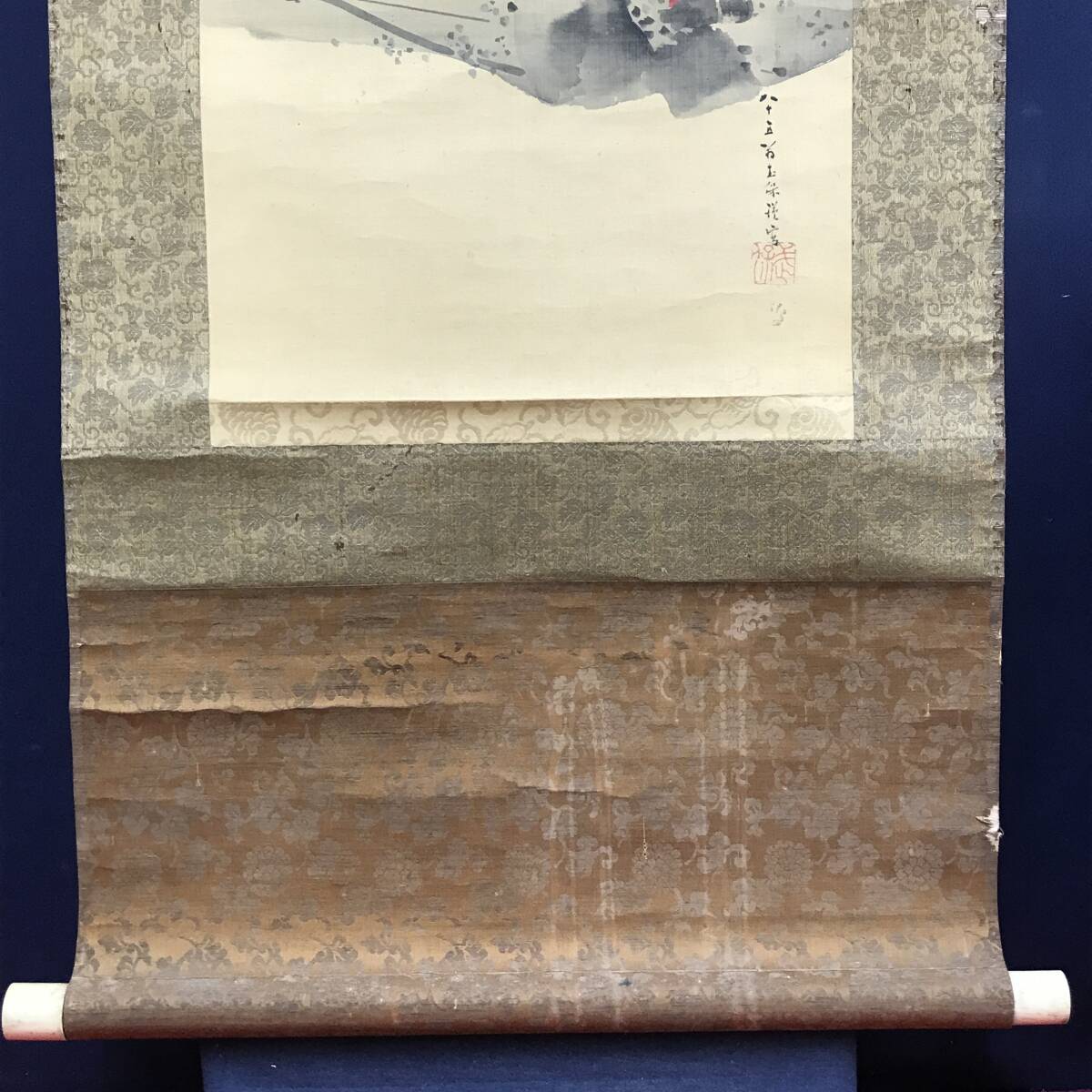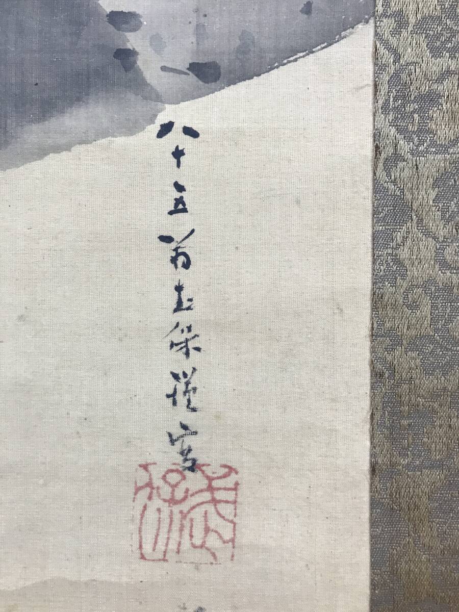 【作品状態】 本紙は絹本肉筆です。本紙は薄汚れ、多少の汚れシミ、折れ、巻シワあります。表装は時代感あり、薄汚れ、汚れシミ、全体に多数の割れ、ホツレ、巻シワあります。