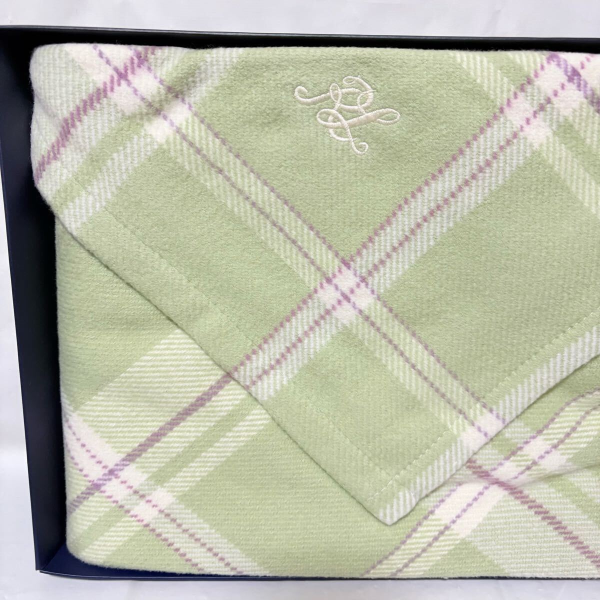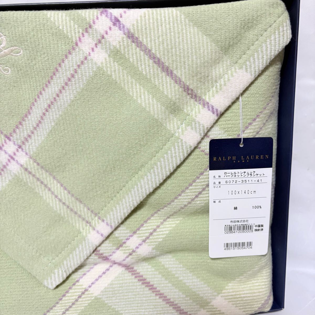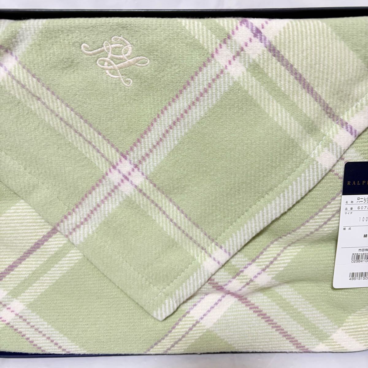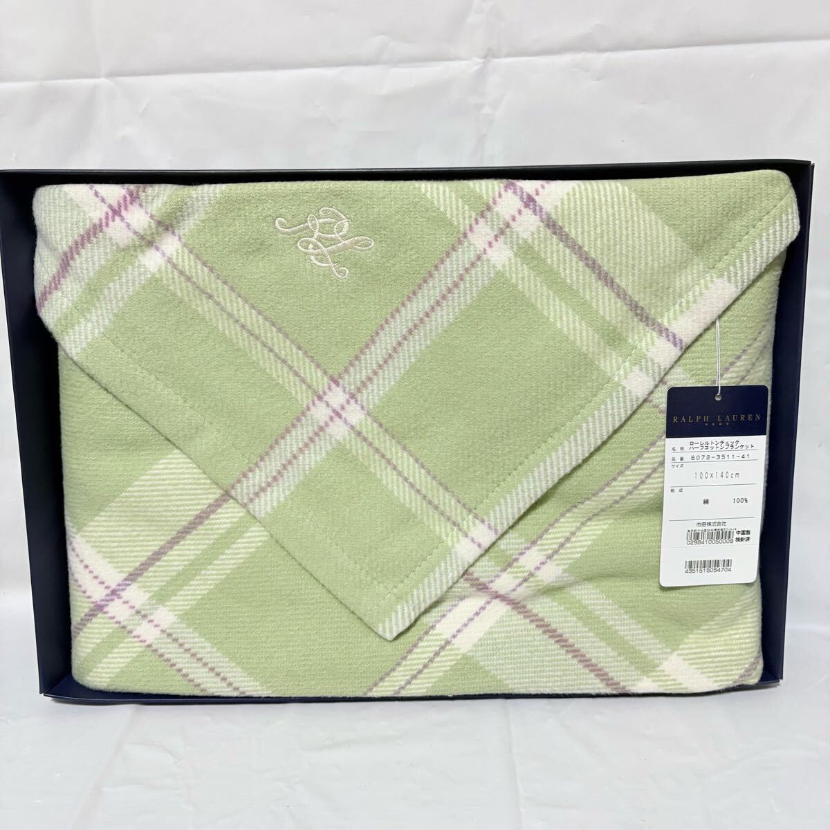 美品未使用タグ付き Ralph Lauren ラルフローレン ローレルトンチェックハーフコットンブランケット 100×140cm ライトグリーン