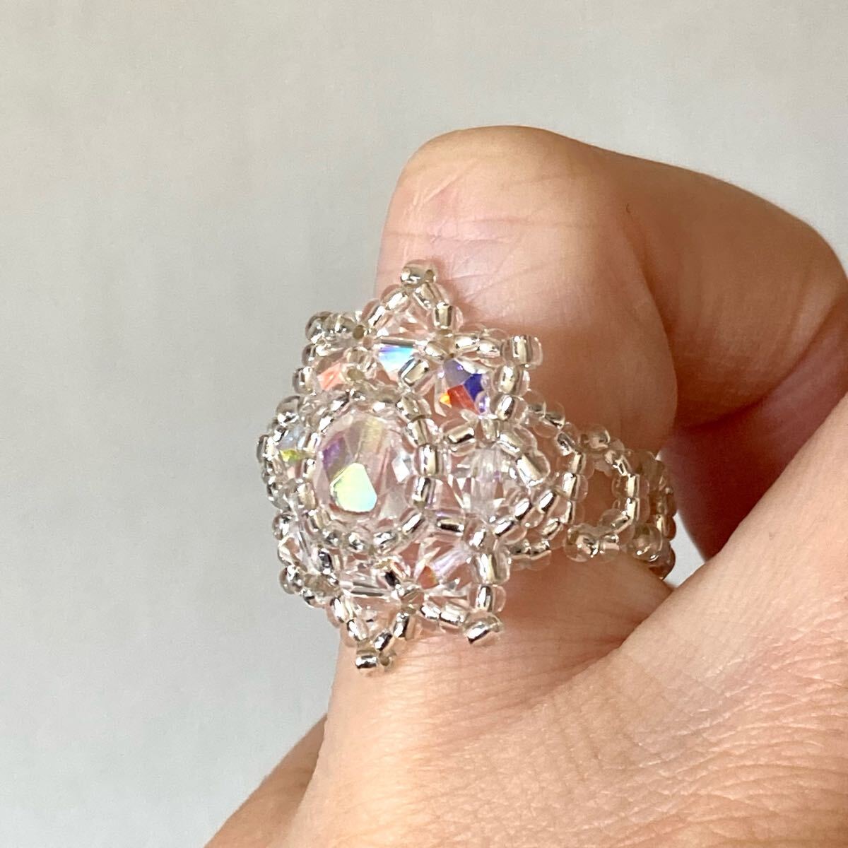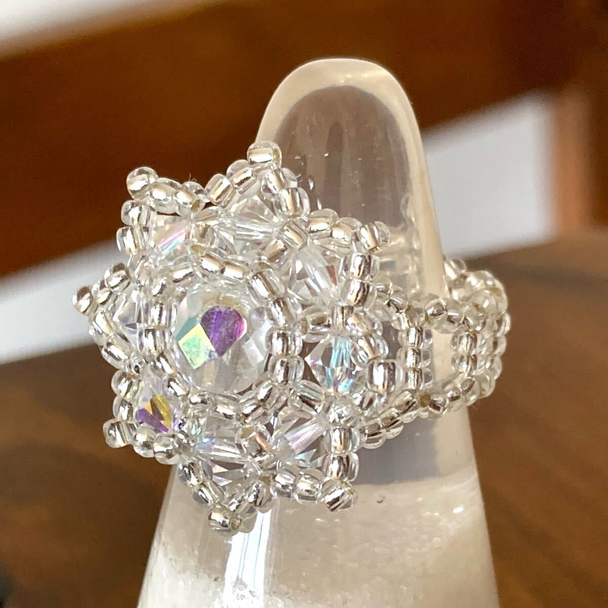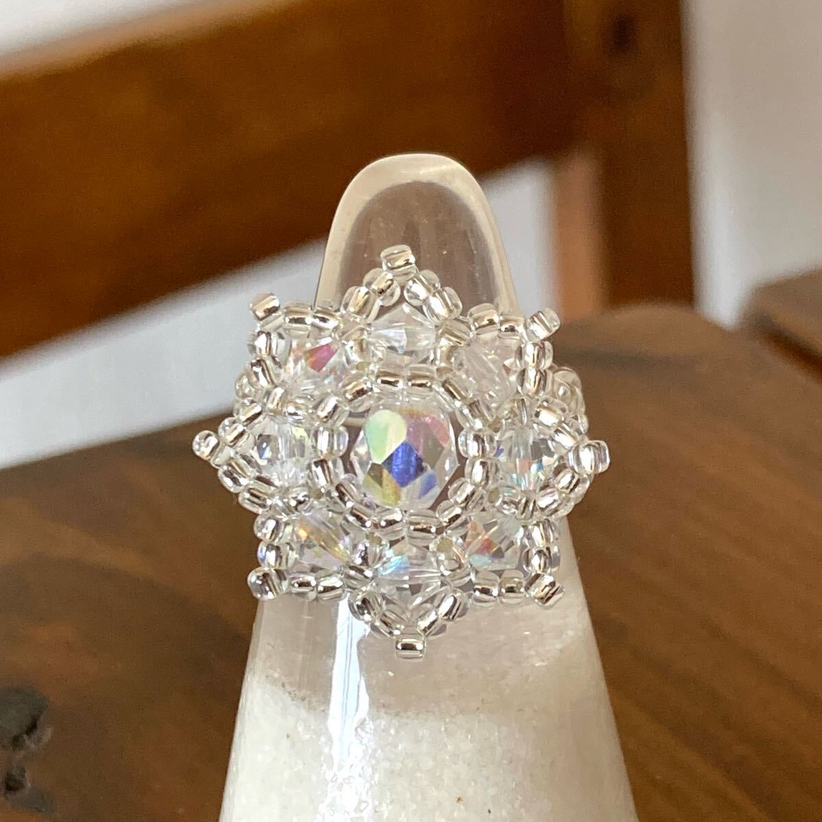 6mmのクリアオーロラのチェコビーズ、4mmのクリアオーロラのスワロフスキー、クリアシルバーの丸小ビーズで作ったリングです。