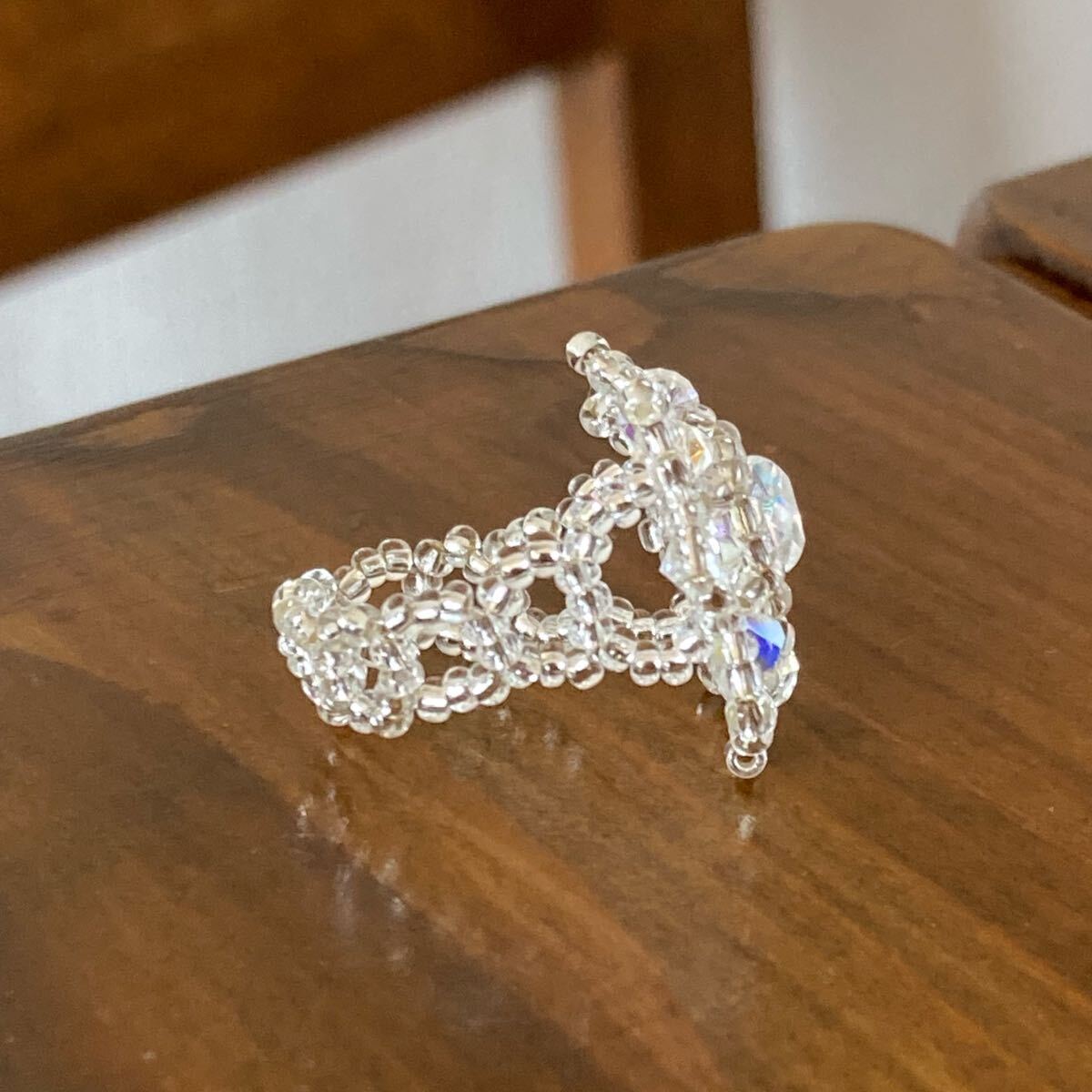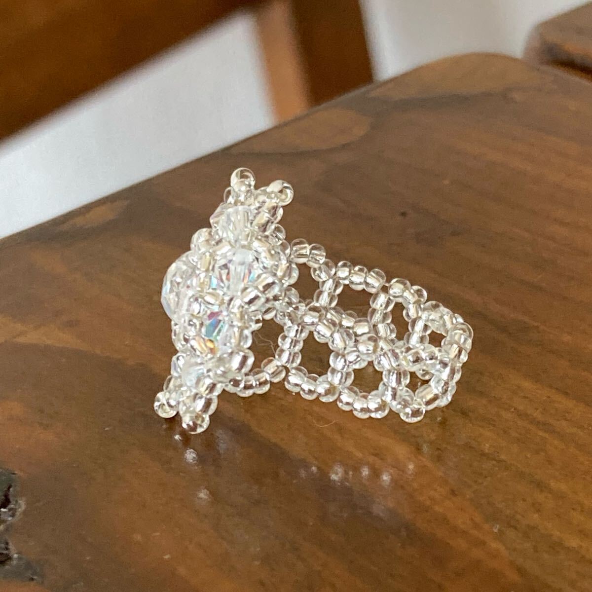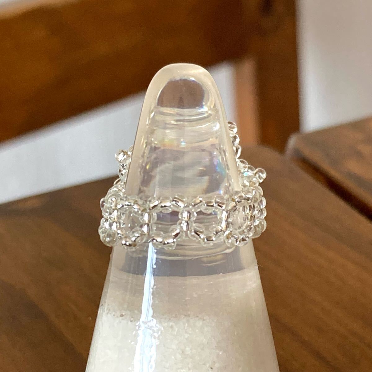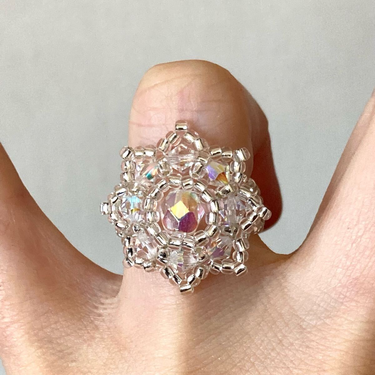 6mmのクリアオーロラのチェコビーズ、4mmのクリアオーロラのスワロフスキー、クリアシルバーの丸小ビーズで作ったリングです。