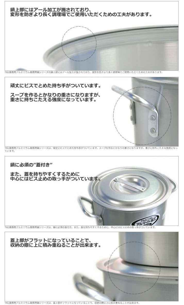 ■メーカー 遠藤商事 TKG ■商品名 業務用 寸胴鍋 36cm半寸胴鍋 ●サイズ:外径×深さ(mm)380×230 内寸 φ35.5cm ●底板厚(mm):4.0 ●質量(kg):3.5 ●容量(L):23 39cm半寸胴鍋 ●サイズ:外径×深さ(mm)415×240 内寸 φ38.5cm ●底板厚(mm):4.0 ●質量(kg):4 ●容量(L):28