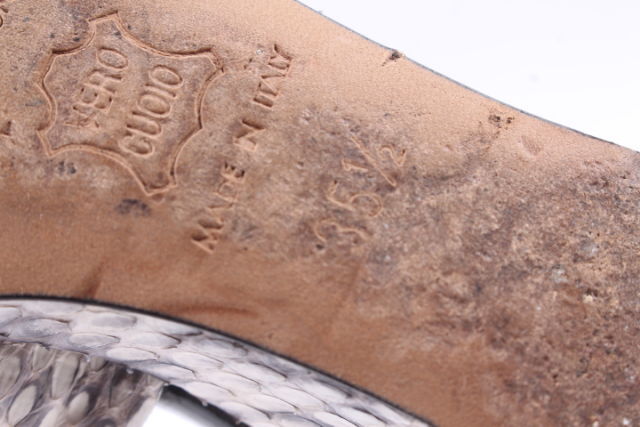 【状態】表面→アッパーに変色あり。 内側→ストラップにシワあり。インソールのつま先にダメージあり。 ソール→所々にダメージや汚れあり。つま先に前オーナー様による裏張りあり。 ヒール→数ヶ所にダメージあり。リフトに減りあり。