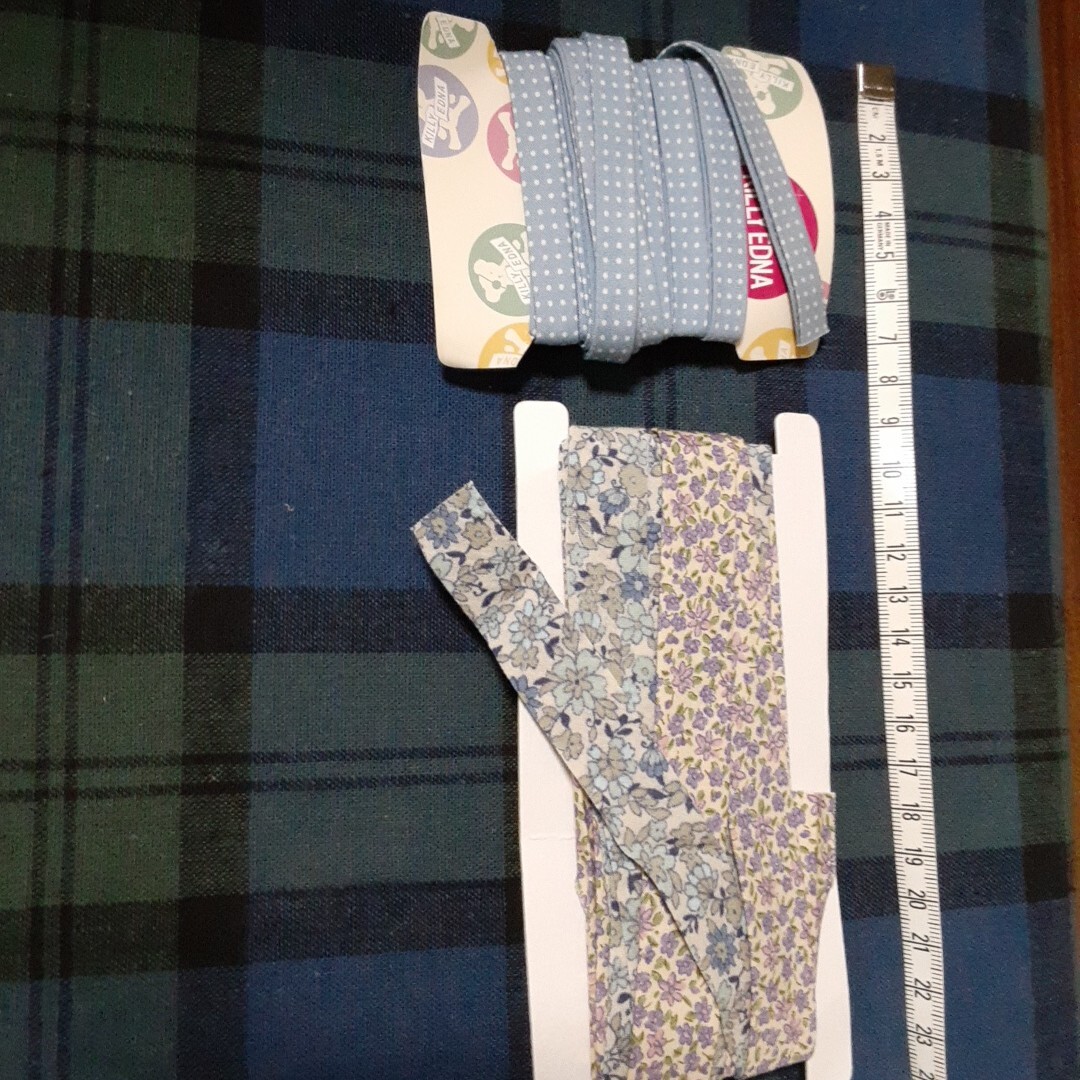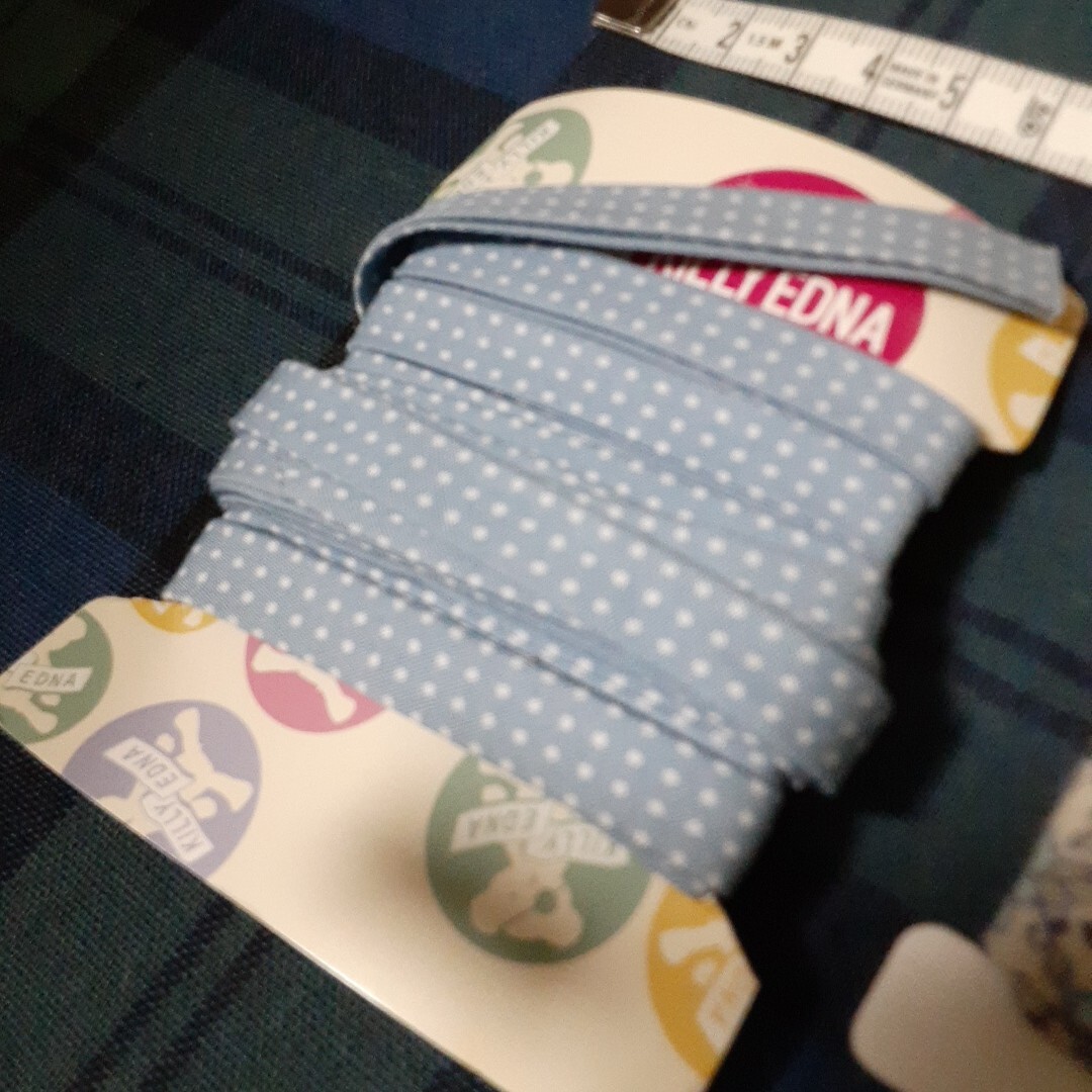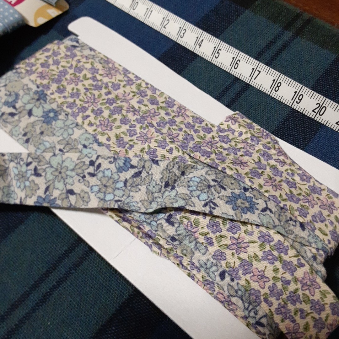 三つのバイアステープ。巻いてあるため長さ分かりません。何重にもなっているので、小物作れます。お安くします。