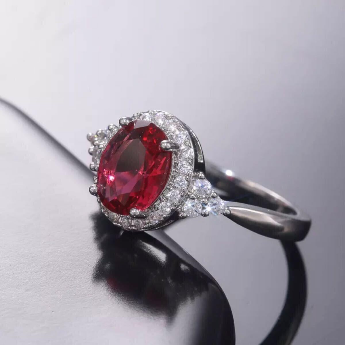 中央に輝くAAACZルビーと周りを彩るCZダイアモンドが視線を集めるリングです。上品な華やかさがあるお品です。カジュアルからフォーマルまで、幅広いファッションに合わせてお楽しみいただけます。