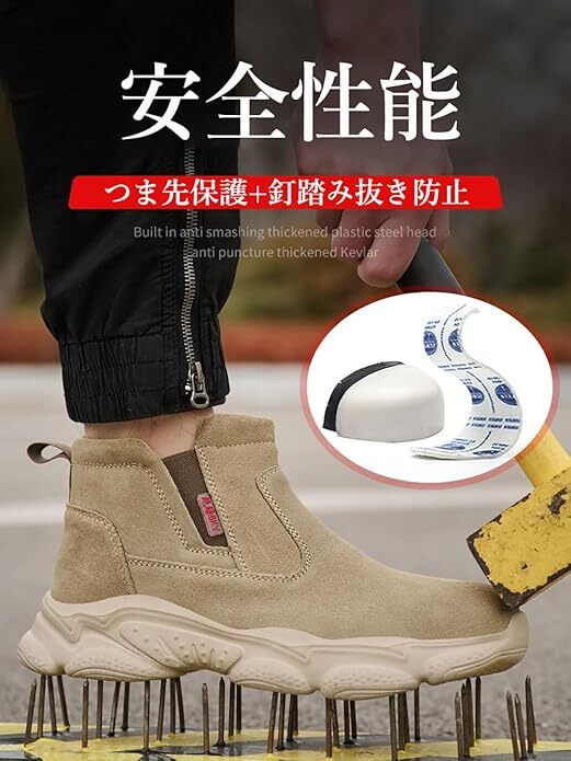 【つま先保護+踏み抜き防止】樹脂先芯を内蔵して足先をしっかりと保護します。保護と軽量性を兼ね備えています。また、ケブラー中底を搭載し、釘や鉄棒のような鋭利な物から、足裏をしっかりと守ります。