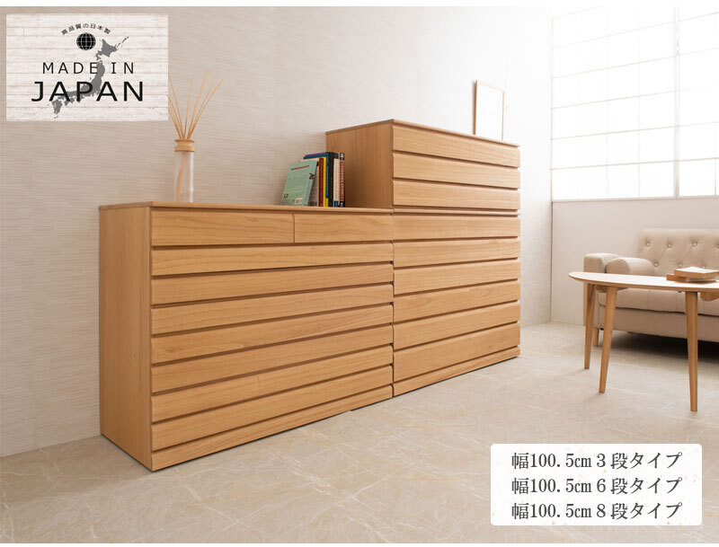 ■商品について/取っ手金物を排除し桐箪笥の概念を覆したモダンな印象の桐箪笥シリーズに三つ折り着物・帯・小物収納に最適なサイズが登場。和室はもちろん、洋室にも合うこだわり設計。桐の素材の風合いをそのまま活かした生地仕上げ、緩やかな木目を生かしたナチュラル、ブラウンカラーの3タイプをご用意。多段のラインからできる影は見てるだけで心地いい。通常の桐箪笥とは違い、天板に重い物を載せれる様に、15mm厚の2枚重ねを採用したところもこだわりポイントです。桐材は着物や浴衣、洋服など長期保管に最適です。