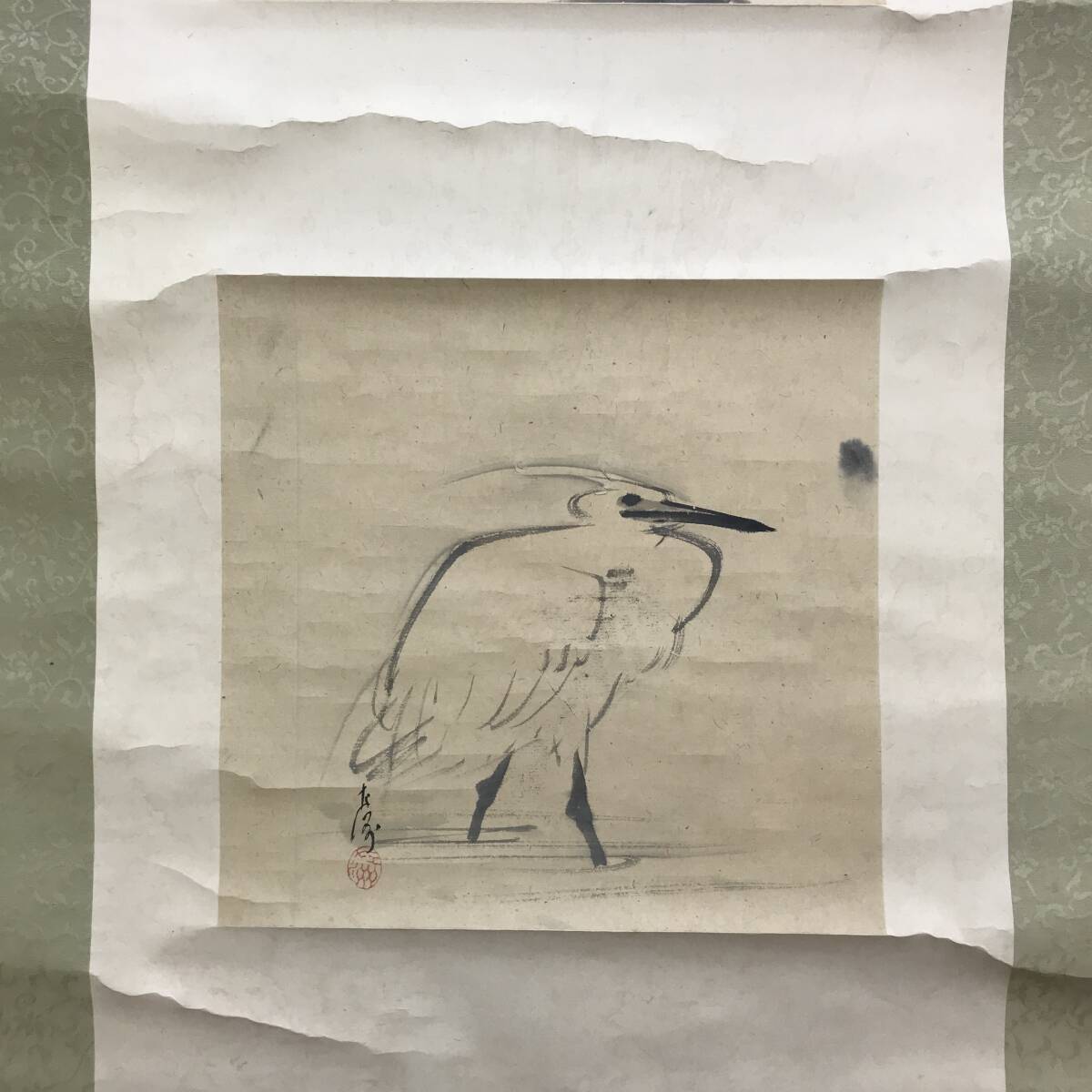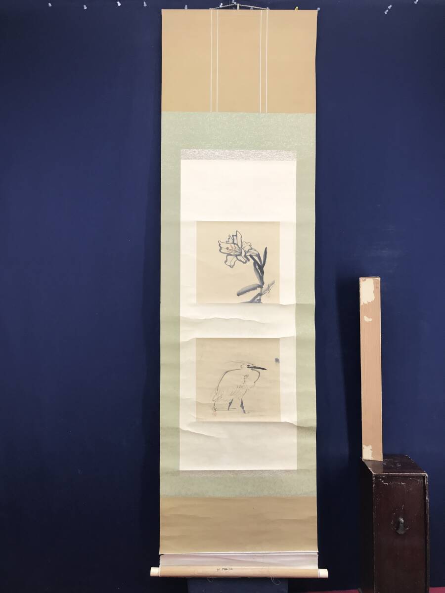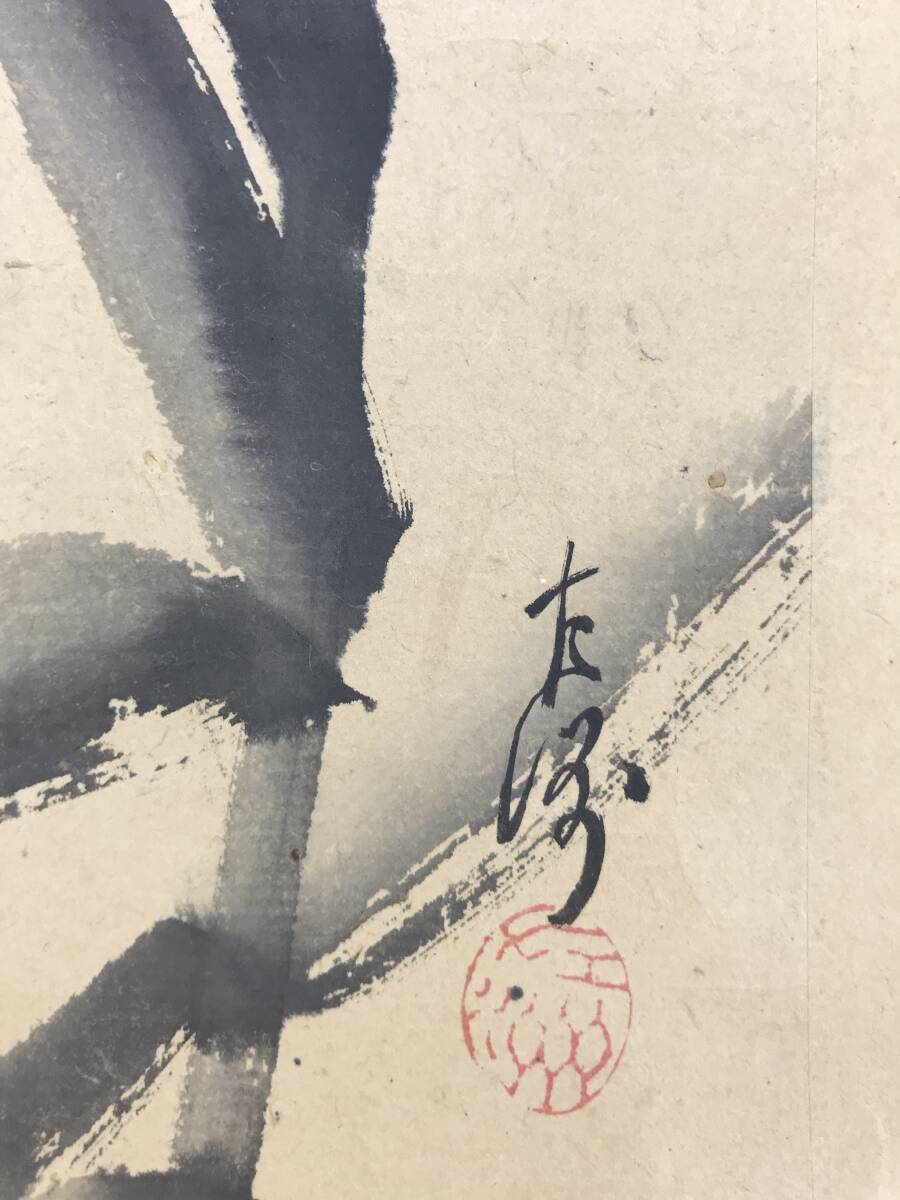 【作品状態】 本紙は紙本肉筆です。本紙は薄汚れ、多少の汚れシミ、小シワあります。表装は最下部に補修痕、多数の折れ、巻シワあります。