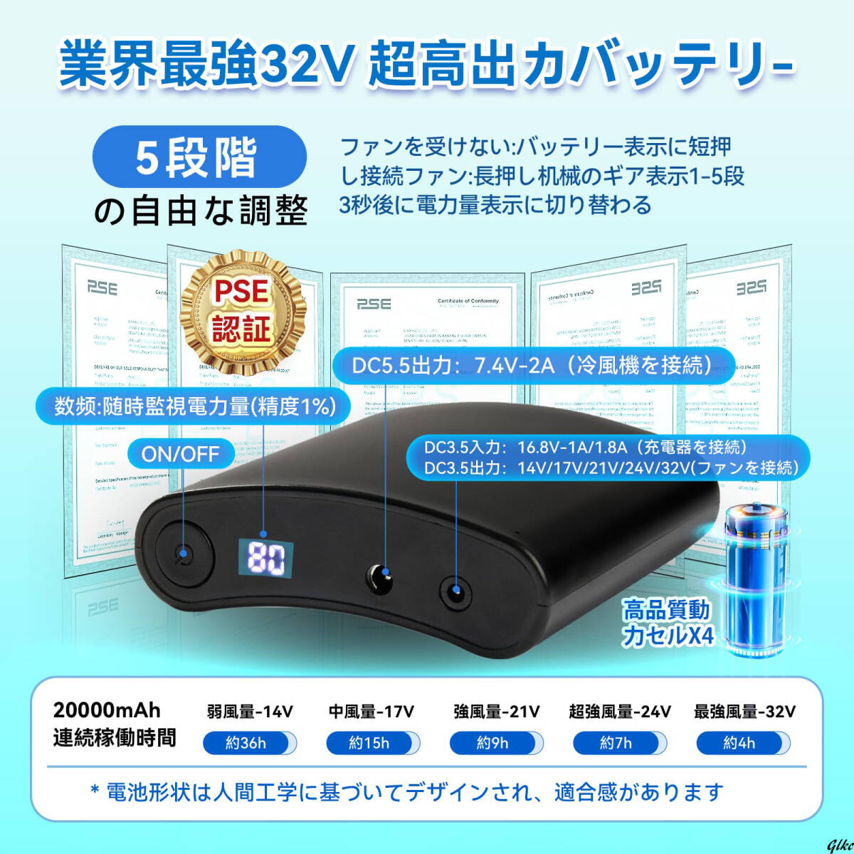 ・バッテリー:32V高出力/20000mAh/LED液晶ディスプレイ搭載/PSE認証済/5段階風量調整(14V〜32V)