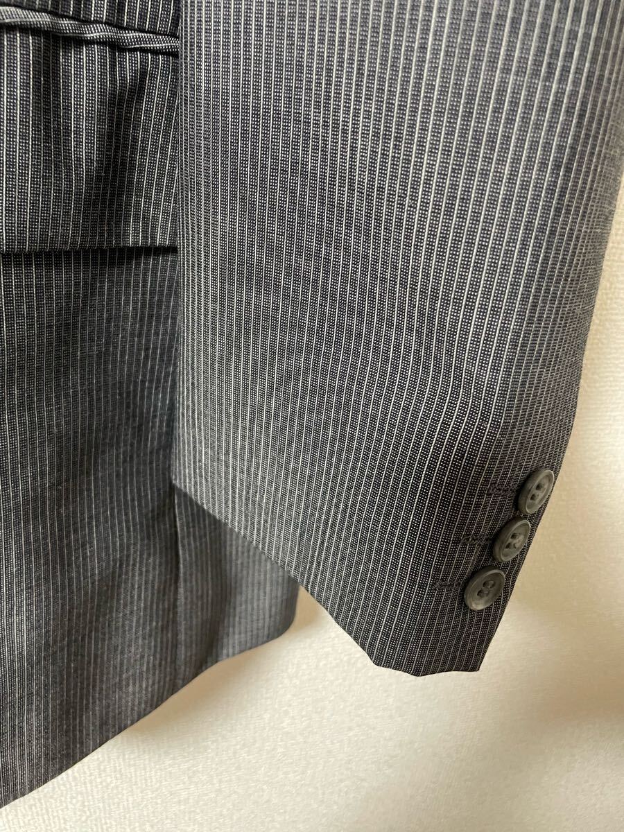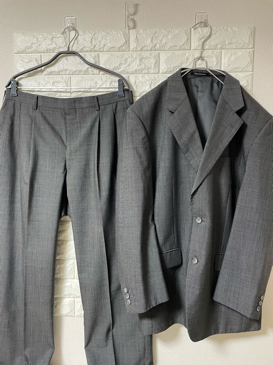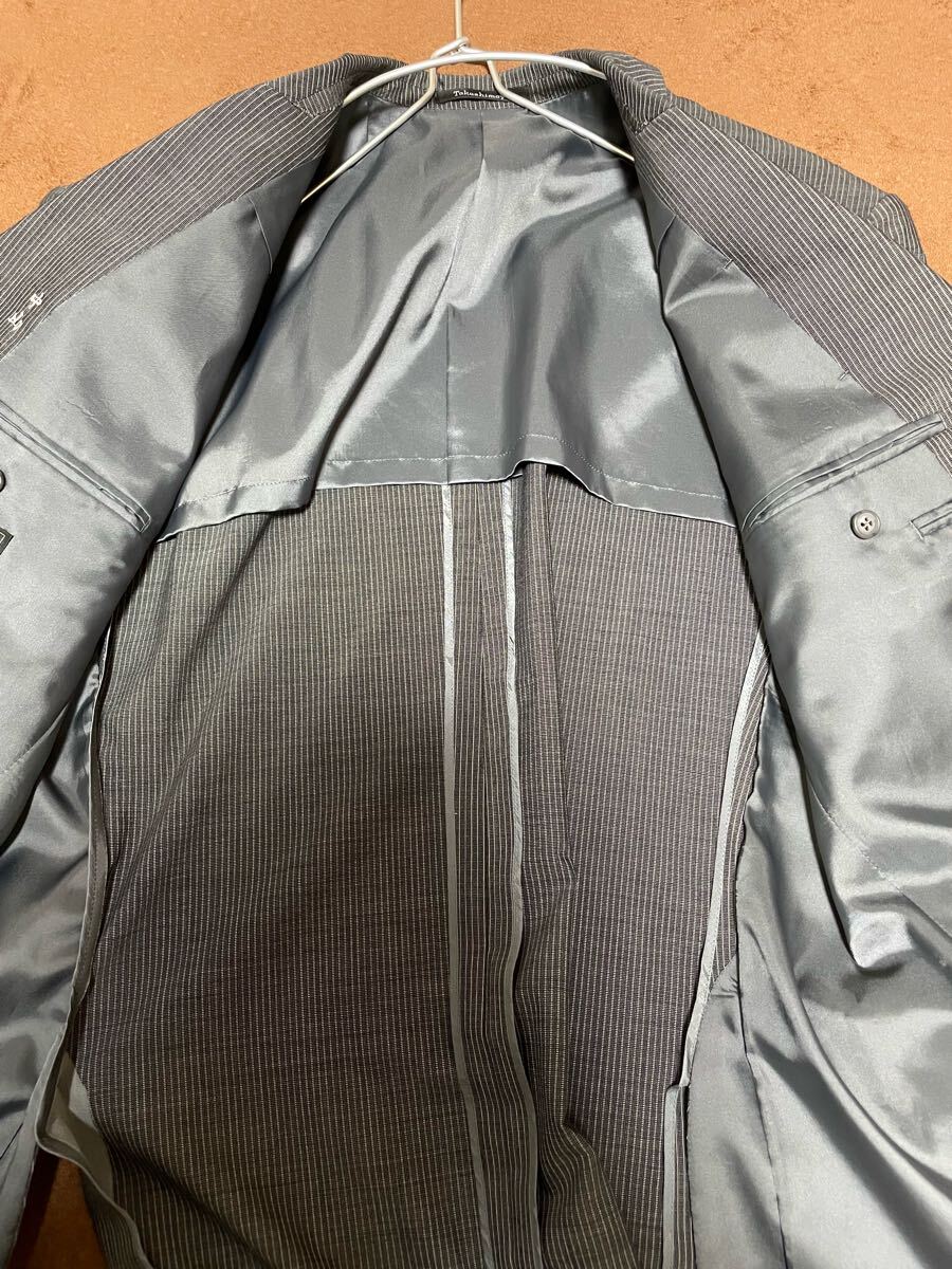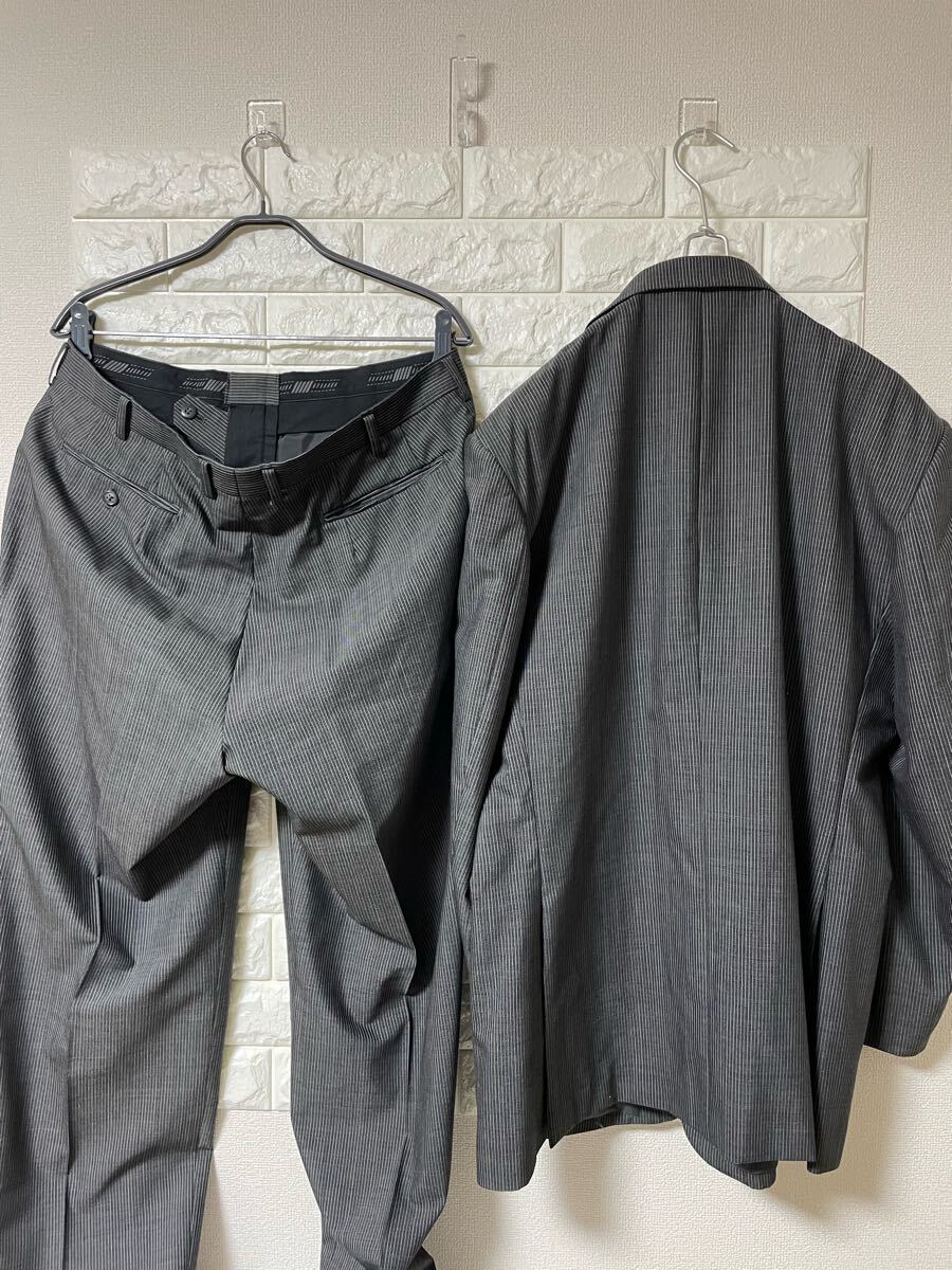 グレーのストライプビジネススーツ、ダブルボタンジャケットとスラックスのセット。