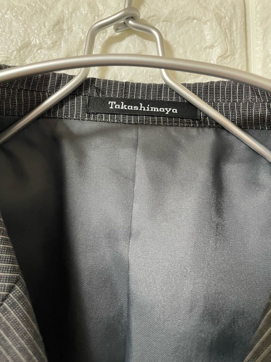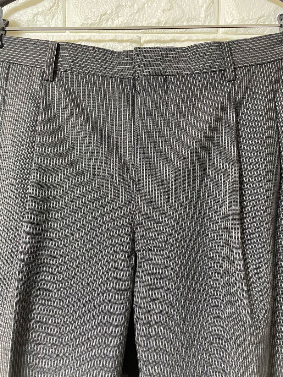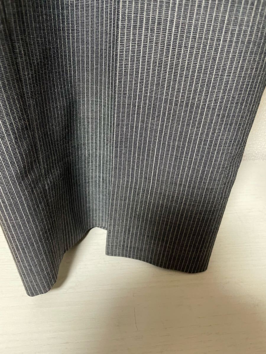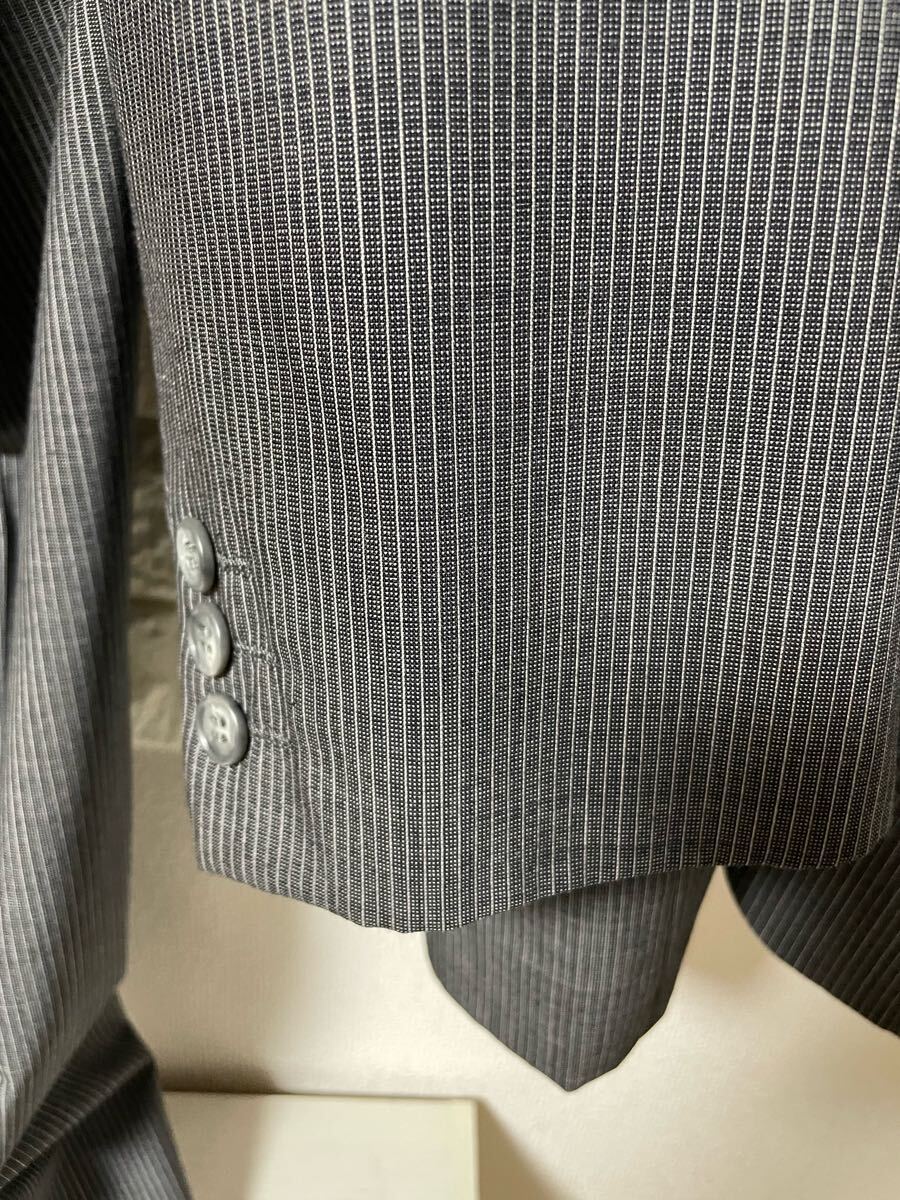 グレーのストライプビジネススーツ、ダブルボタンジャケットとスラックスのセット。