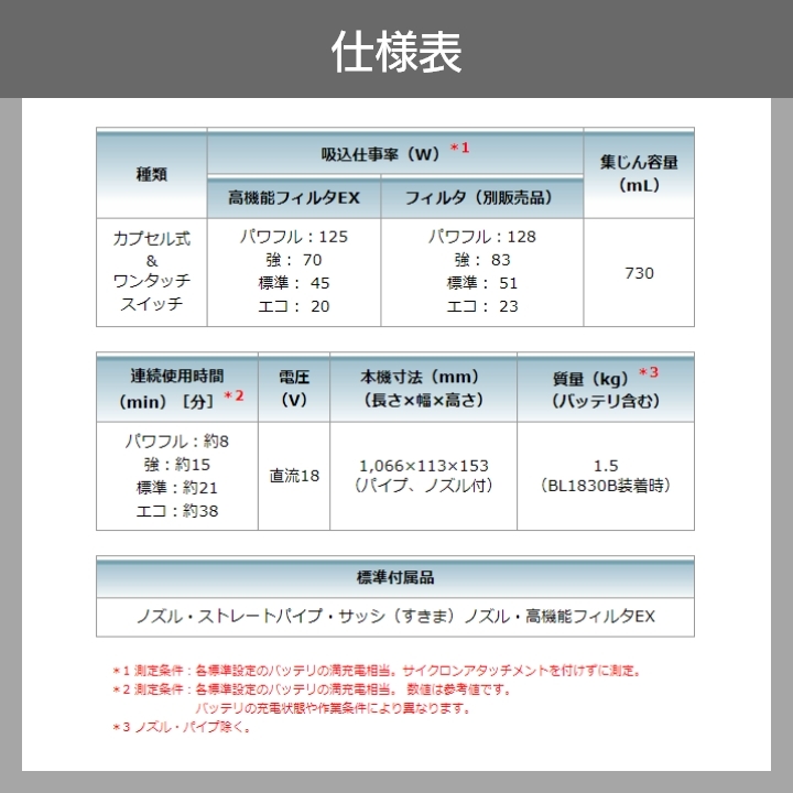 標準付属品:ノズル、ストレートパイプ、サッシ(すきま)ノズル、高機能フィルタEX