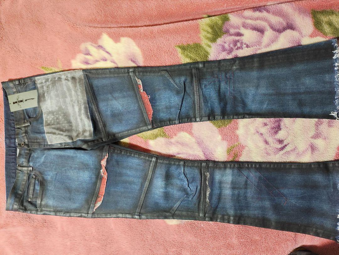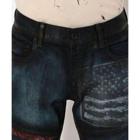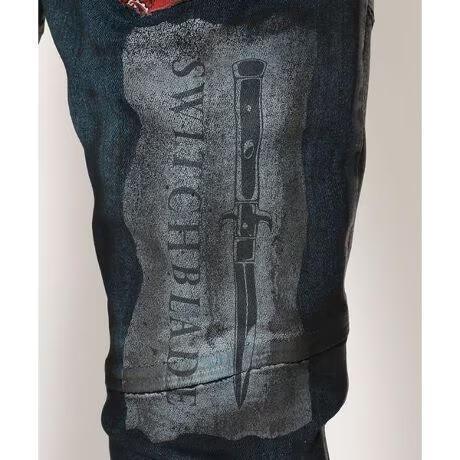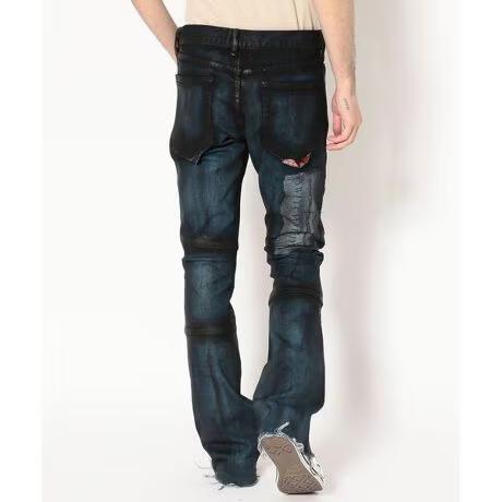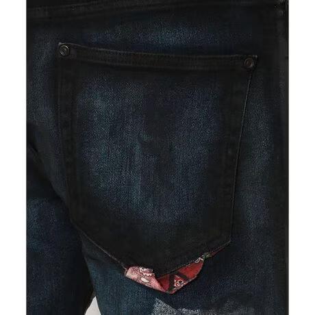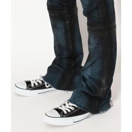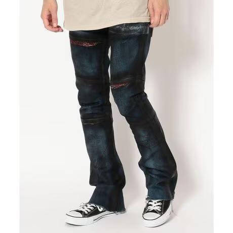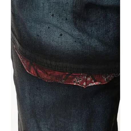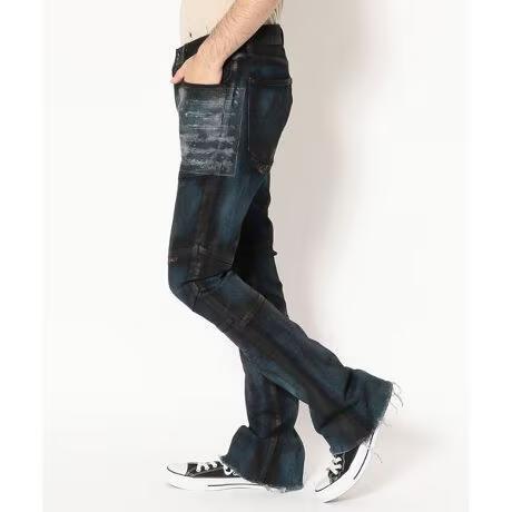 ブーツカットシルエットのリメイクパンツ。バンダナ生地を縫い合わせ、国旗のペーパー加工が施されています。ストレッチが効いている為、履き心地の良さもポイントです。少しルーズめに履いて頂きたい一着です。 SWITCHBLADE/スイッチブレードHiromu Takahara(元Roenデザイナーで現在BLACK HONEY CHILI COOKIEデザイナー)とHYDEによるブランドです。 時代の変化の中 不良でいる良さを失くしたくない 内に秘めたナイフのように自分なりのナイフを出せる人達に向けたブランドです。