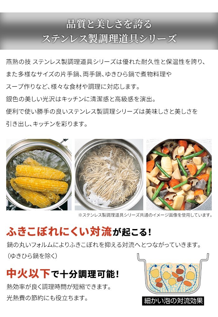 | ~燕熟の技~ ステンレス調理道具シリーズは、優れた耐久性と保温性を誇り、また多様なサイズの片手鍋、両手鍋、ゆきひら鍋で煮物料理やスープ作りなど、様々な食材や調理に対応します。 銀色の美しい光沢はキッチンに清潔感と高級感を演出。便利で使い勝手の良いステンレス製調理道具シリーズは美味しさと美しさを引き出し、キッチンを彩ります。 少量の煮物、蒸し物に最適。 |