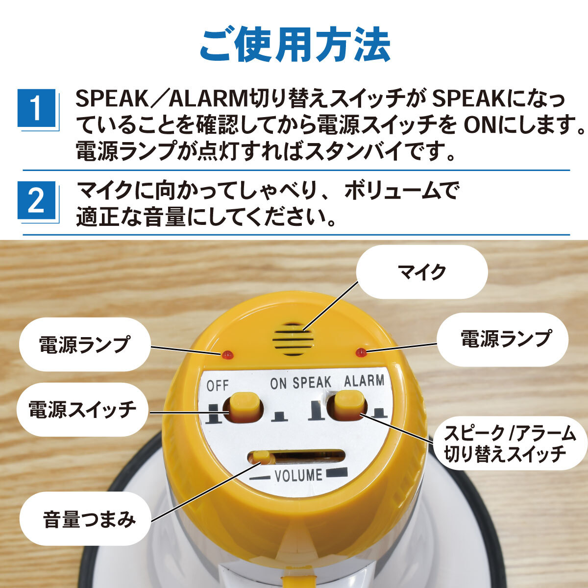 ● 単2形乾電池×4本で使えるハンディメガホンです。(乾電池別売)