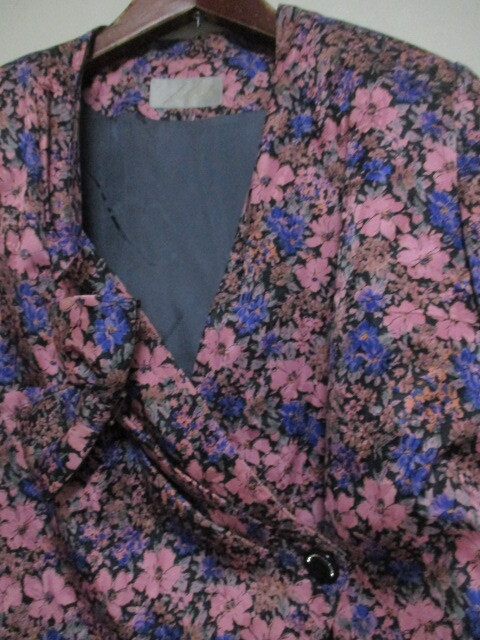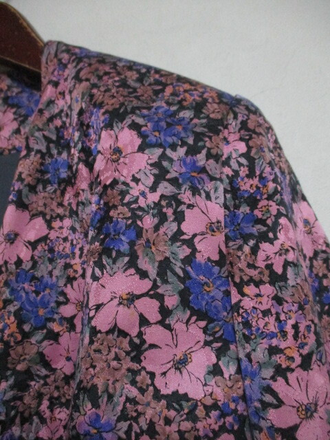 商品紹介 | ピンクを基調とした花柄がメインとなったジャケットです。 カシュクールのような形で、左前は内側をボタンで留める ようになっています。 襟元のリボンは右側は縫い付けられていて、 左側をピンで留める形です。 《素材》 表地:絹100% 裏地:キュプラ100% ※肩パットが入っています。(裏地の中) |