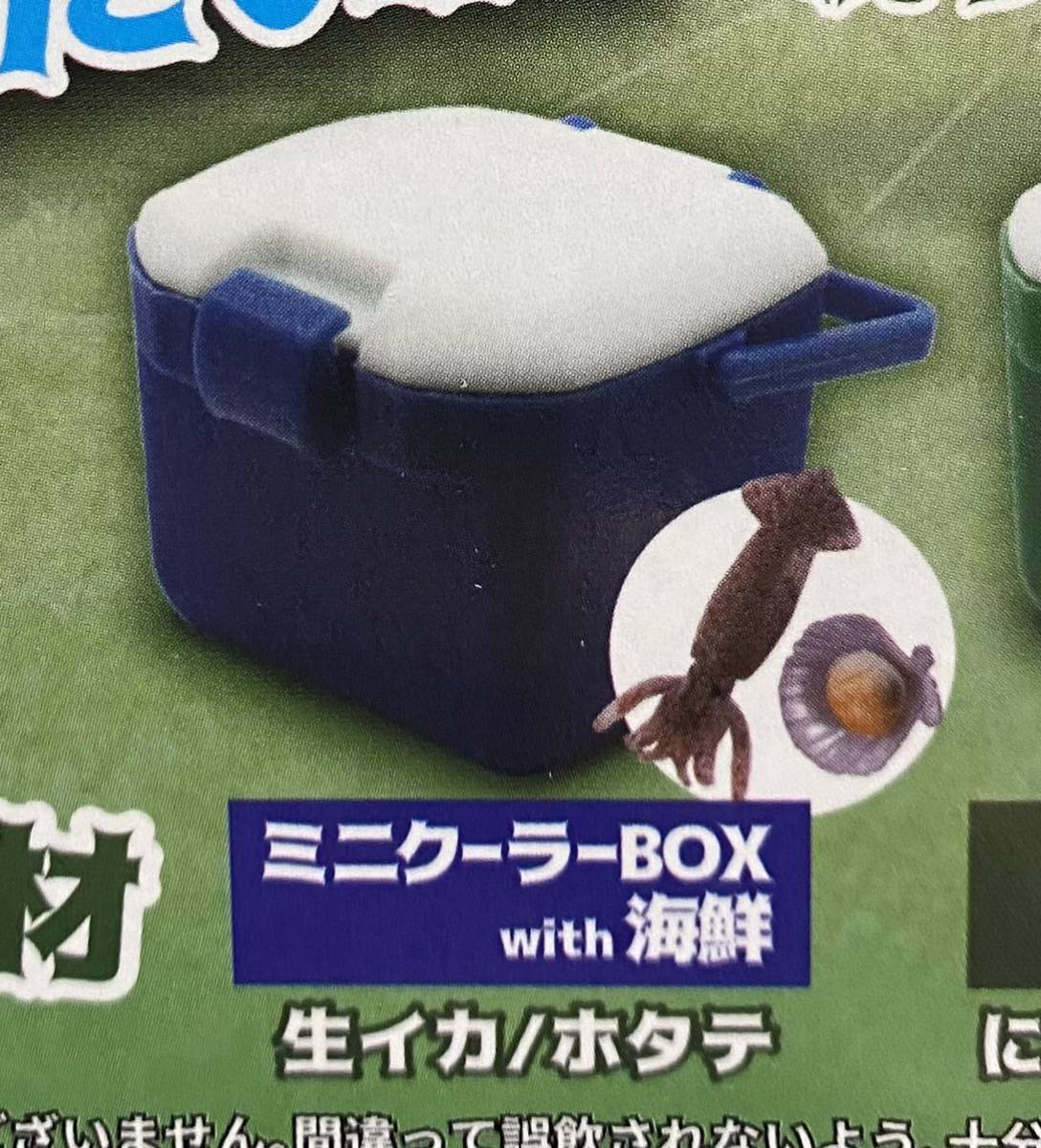 ★ミニチュアフィギュア★ガチャガチャ本当に使える!?ミニクーラーBOX 青 with海鮮 生イカ、ホタテ