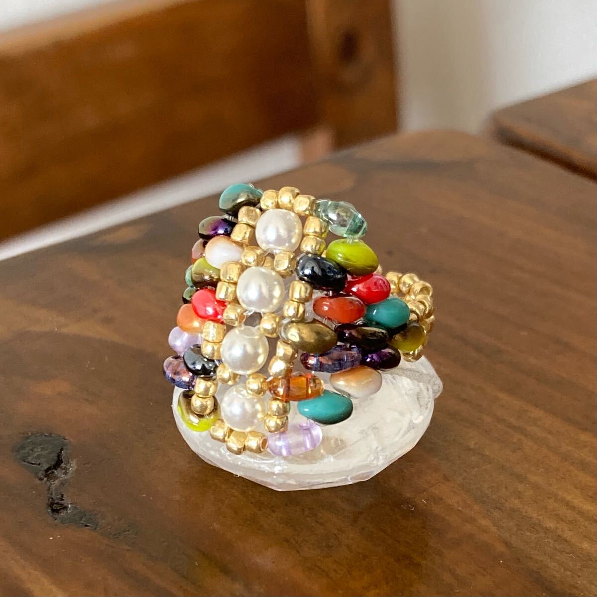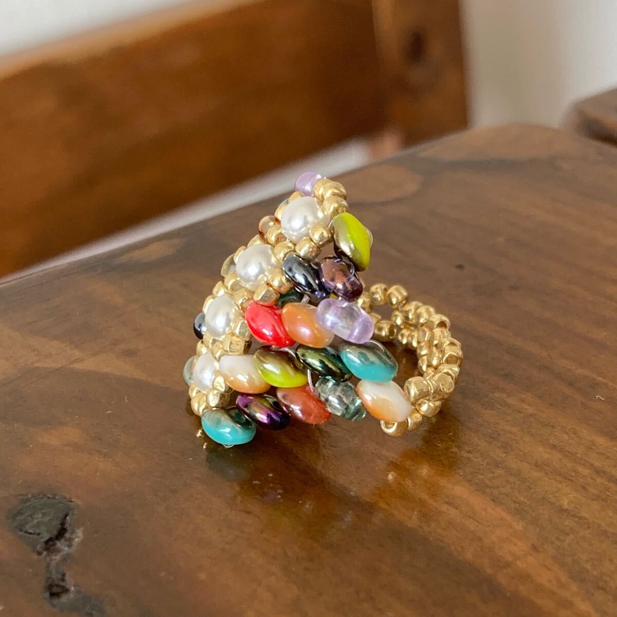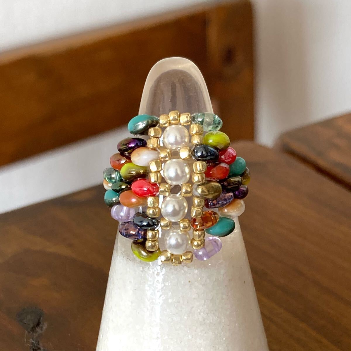 縦に並んだパールビーズとカラフルな色合いが可愛いリングです♪