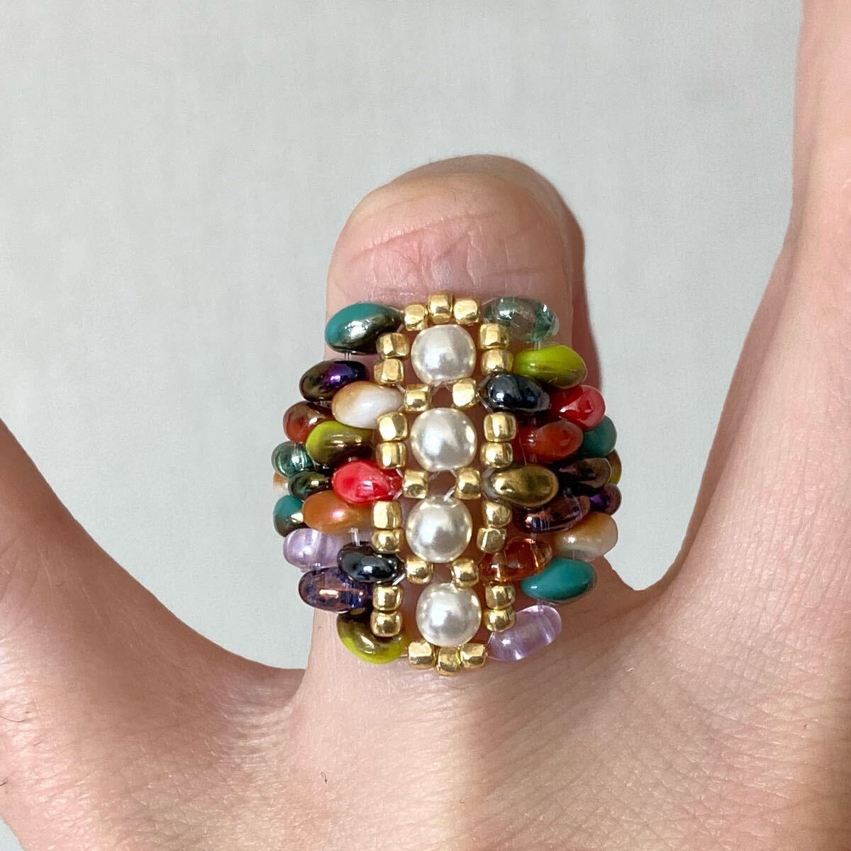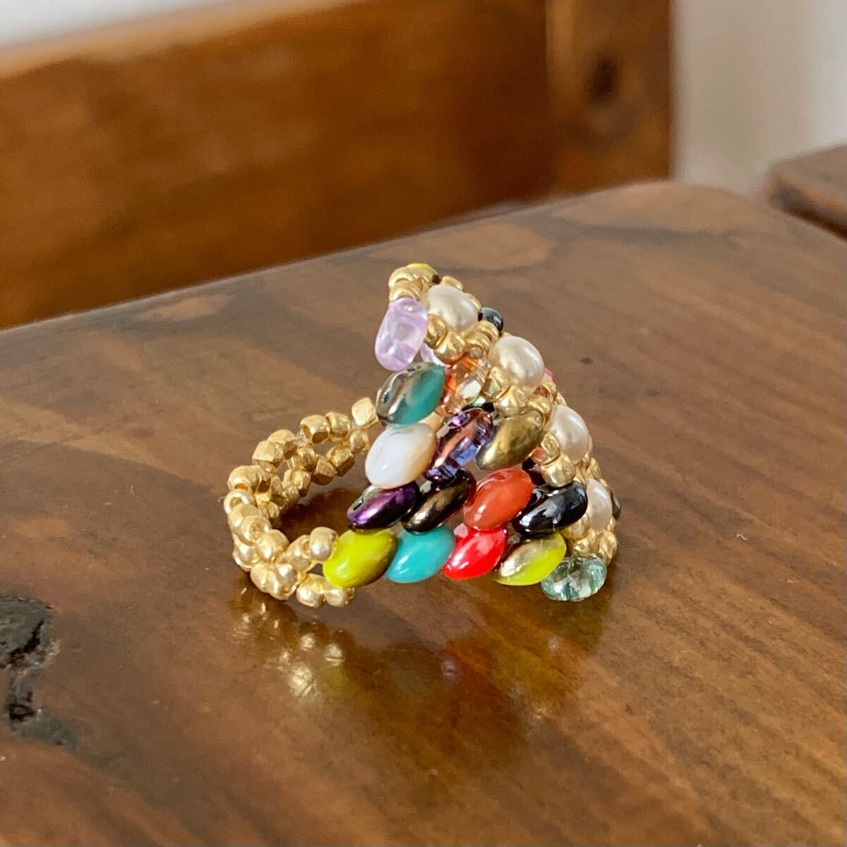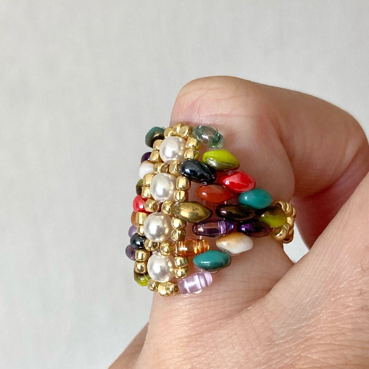 縦に並んだパールビーズとカラフルな色合いが可愛いリングです♪