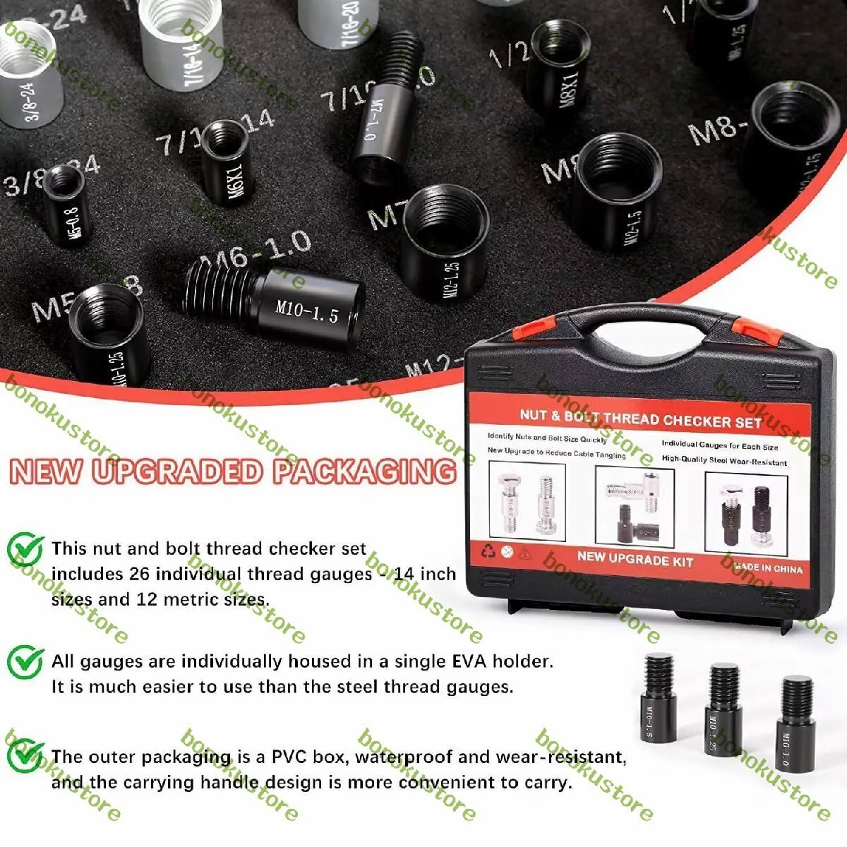 スレッドチェッカーキット:各スレッドチェッカーは慎重にカットされたフォームに挿入され、所定の位置にしっかりと保持され、個々のネジやナットを測定するために大量のゲージを持ち運ぶ必要がなくなるため、付属のナットやスレッドチェッカーよりも使いやすくなります。