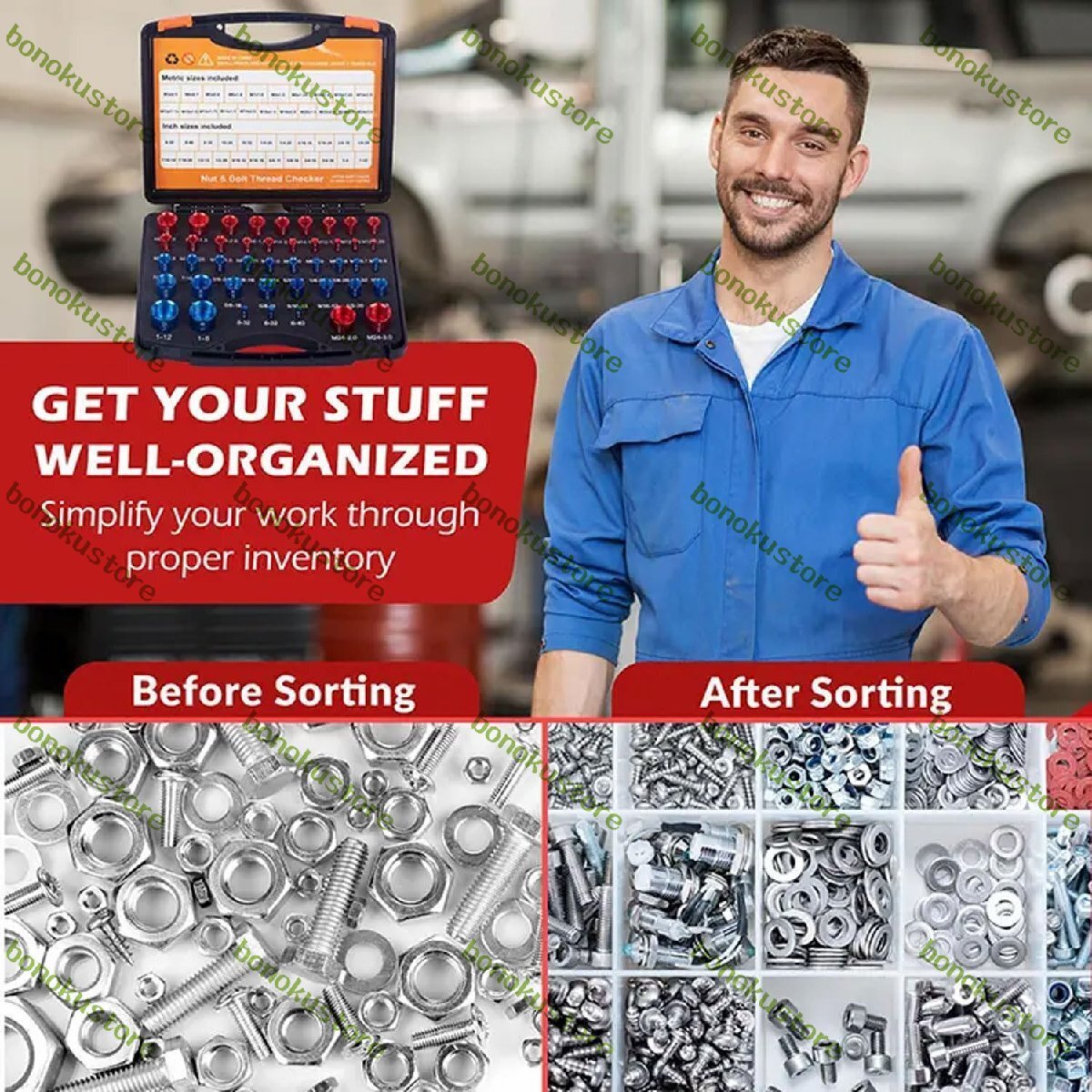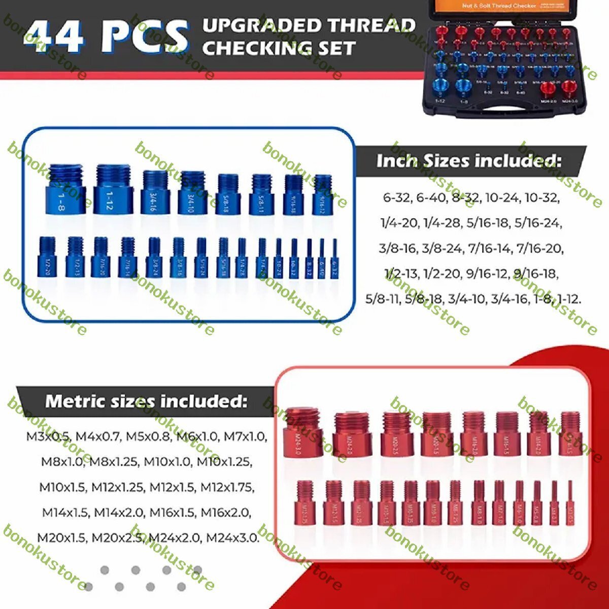 名前: ナットとボルトのねじチェッカー 数量:44個セット サイズ: 30*20*6 センチメートル、カートン + フォーム包装、単体重量 710 グラム 仕様が含まれています: 44 の仕様 M3x0.5、M4x0.7、M5x0.8、M6x1.0、M7x1.0、M8x1.0、M8x1.25、M10x1.0、M10x1.25、M10x1.5、M12x1.25、M12x1.5、M12x1。 75、M14x1.5、M14x2.0、M16x1.5、M16x2.0、M20x1.5、M20x2.5、M24x2.0、M24x3.0。 インチ: 6-32、6-40、8-32、10-24、10-32、1/4-20、1/4-28、5/16-18、5/16-24、3/8- 16、3/8-24、7/16-14、7/16-20、1/2-13、1/2-20、9/16-12、9/16-18、5/8-11、 5/8-18、3/4-10、3/4-16、1-8、1-12