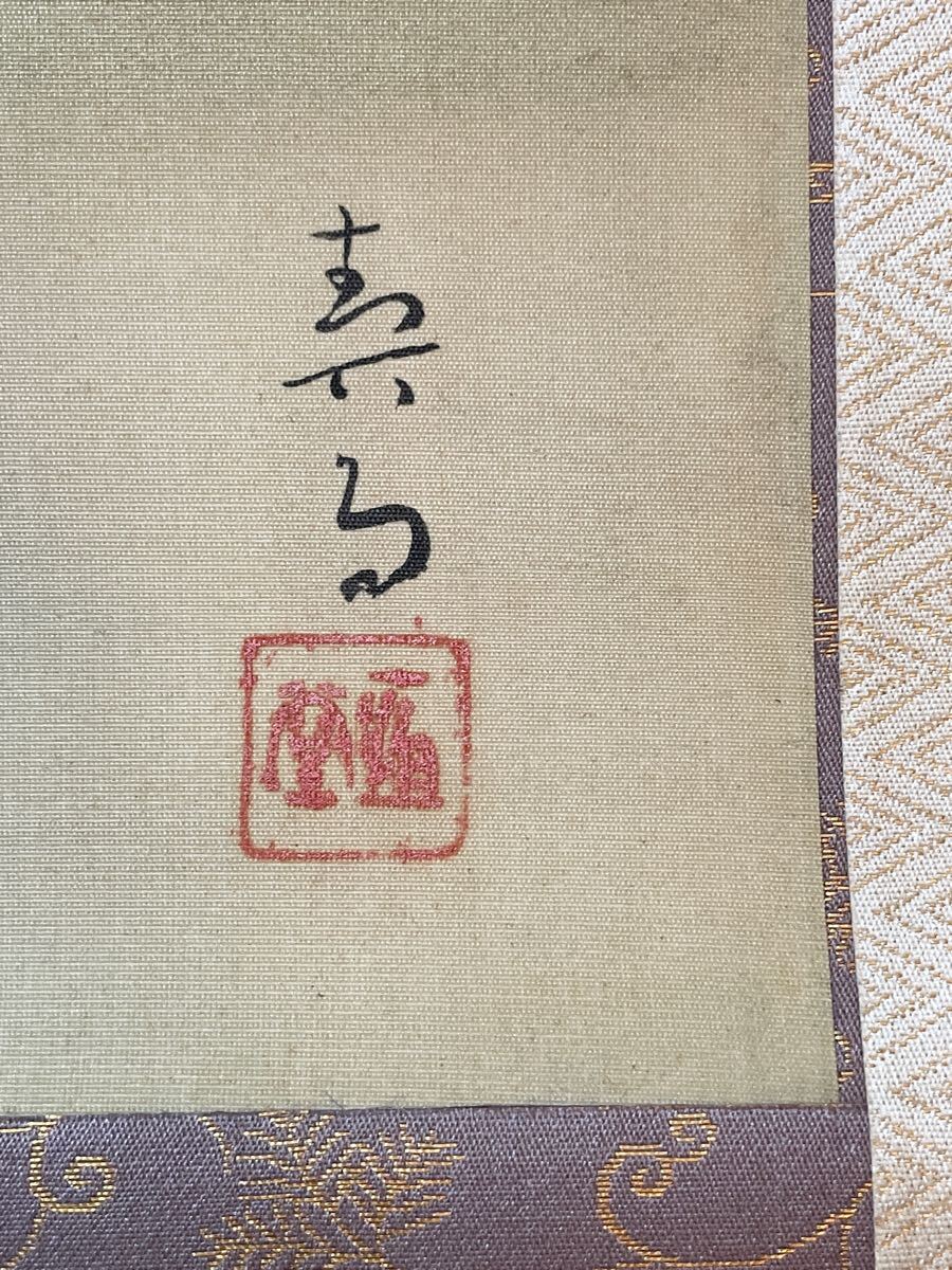 出品の掛軸は、ハンコに朱肉(赤色絵具)が付きすぎているので、朱肉の量を割り引いてご参照ください。