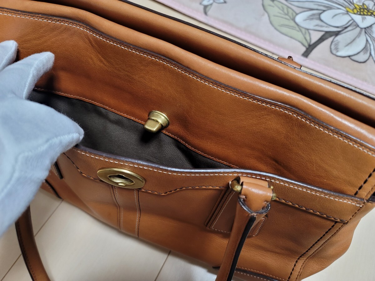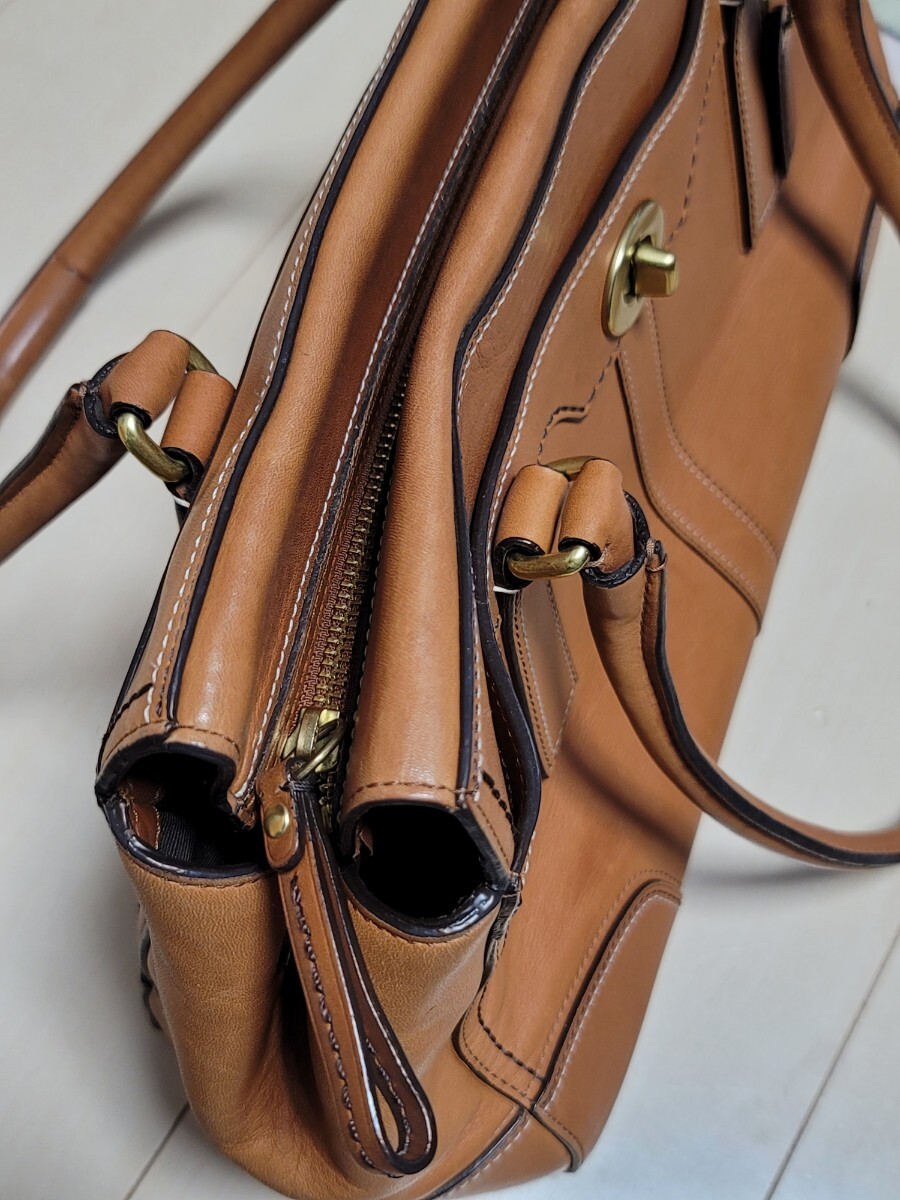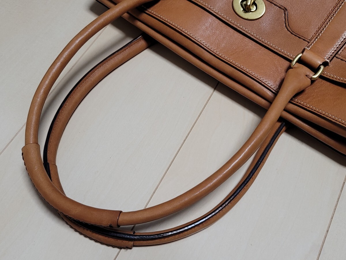 ◆総レザーの自立性のあるトートバッグになります。ファスナー開閉式なので貴重品も安心です。ひねり金具の外ポケットがレトロ調のデザインです。