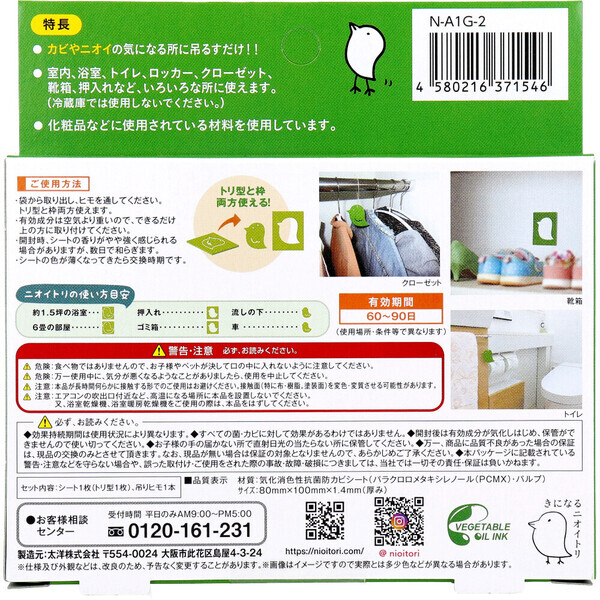 きになるところのカビやニオイを撃退! カビやニオイの気になる所に吊るすだけ! 防カビ・抗菌・消臭 ・室内、浴室、トイレ、ロッカー、クローゼット、靴箱、押し入れなど、いろいろな所に使えます。 (冷蔵庫では使用しないでください。) ・化粧品などに使われている材料を使用しています。 個装サイズ:125X128X16mm 個装重量:約24g 内容量:1枚入 製造国:日本 【発売元:太洋株式会社】 【セット内容】 シート1枚(トリ型1枚)、吊りヒモ1本 【有効期間】 60~90日(使用場所、条件等で異なります) 【材質】 気化消色性防菌防カビシート(パラクロロメタキシレノール(PCMX)・パルプ) 【サイズ】 80mm×100mm×1.4(厚み)mm 【使用方法】 ・袋から取り出し、ヒモを通して下さい。 トリ型と枠両方使えます。 ・有効成分は空気よりも重いので、できるだけ上のほうに取り付けてください。 ・開封時、シートの香りがやや強く感じられる場合がありますが、数日で和らぎます。 ・シートの色が薄くなってきたら交換時期です。 【使用上の注意】 ・食べ物ではありませんので、お子様やペットが決して口の中に入れないようにご注意ください。 ・万一使用中に、気分が悪くなるようなことがありましたら、使用を中止してください。 ・本品が長時間何らかに接触する形でのご使用はお避け下さい。 接触面(特に布・樹脂・塗装面)を変色・変質させる可能性があります。 ・エアコンの噴出口付近など、高温になる場所に本品を設置しないで下さい。 又、浴室乾燥機、浴室暖房乾燥機をご使用の際は、本品をはずしてください。 ・効果持続期間は使用状況により異なります。 ・すべての菌・カビに対して効果があるわけではありません。 ・開封後は有効成分が気化しはじめ、保管ができませんので使い切ってください。 ・お子様の手の届かないところで直射日光の当たらない所に保管してください。 注意事項 ※予告なく成分・パッケージが変更になることがございます。 予めご了承ください。 *予告なく成分・パッケージが変更になることがございます。予めご了承ください *ダンボールを使用して発送する場合には、入数以下の個数の場合、 中古ダンボールを使用する場合があり、ご注文の商品とは異なるダンボールになる場合があります。 あらかじめ、ご了承ください。 |