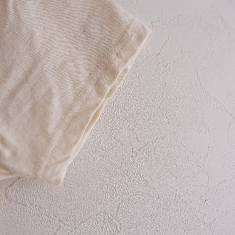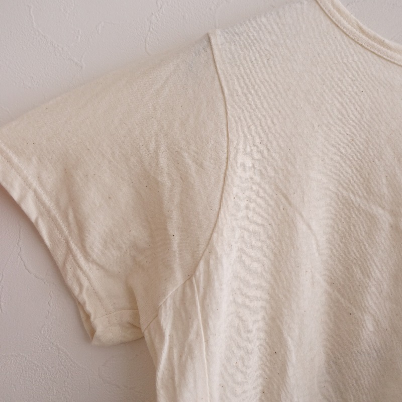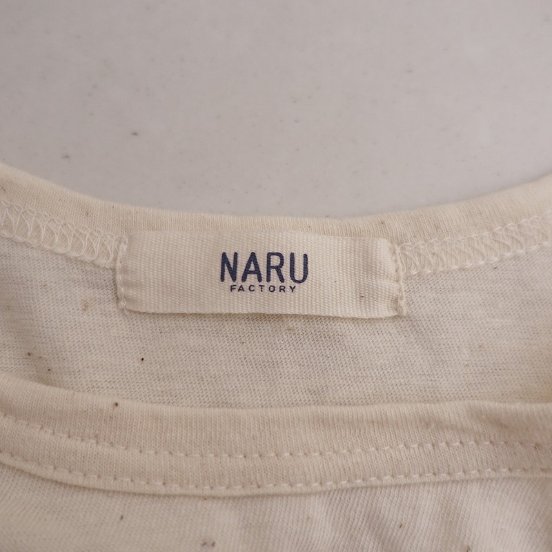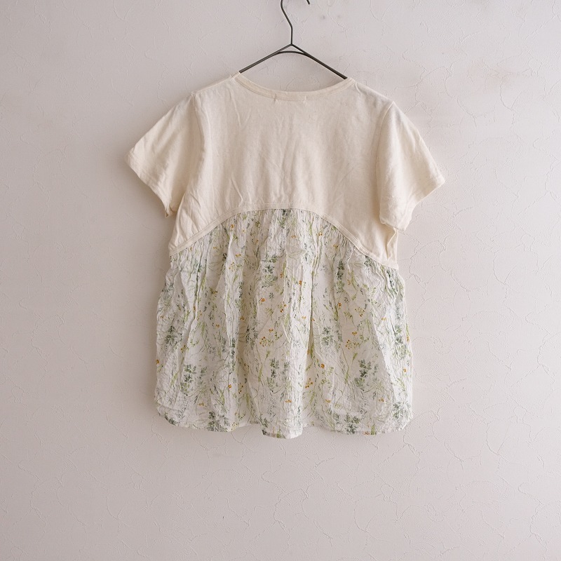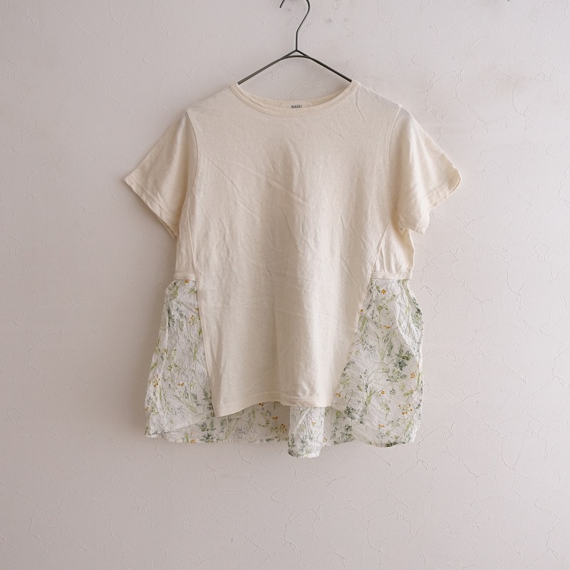 NARUの異素材切り替えコットンカットソーです。カラーは生成りで、コットンのTシャツ地で仕立てられ、切り替え部分は透け感のあるフラワープリントの薄手地に切り替えられています。 |