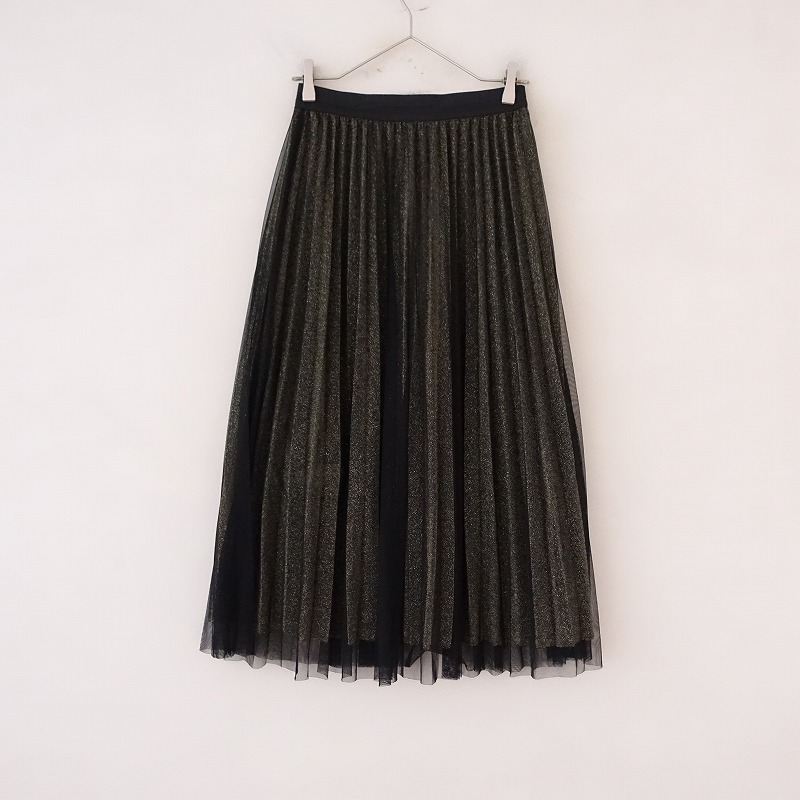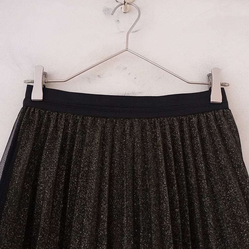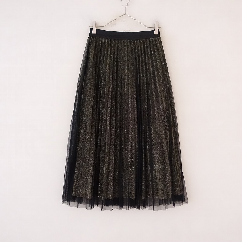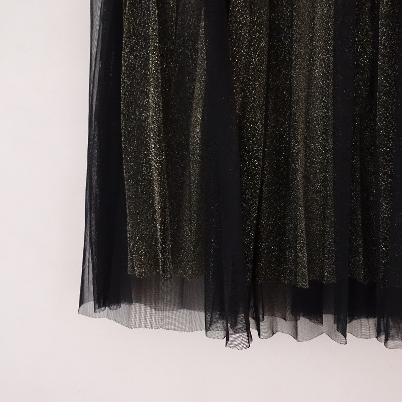 | ADDRESSのラメ×チュールプリーツスカートです。ブラックのカットオフのチュール地×ゴールドラメの裏地の二枚仕立てで、ウエストは平ゴムに切り替えられております。 |