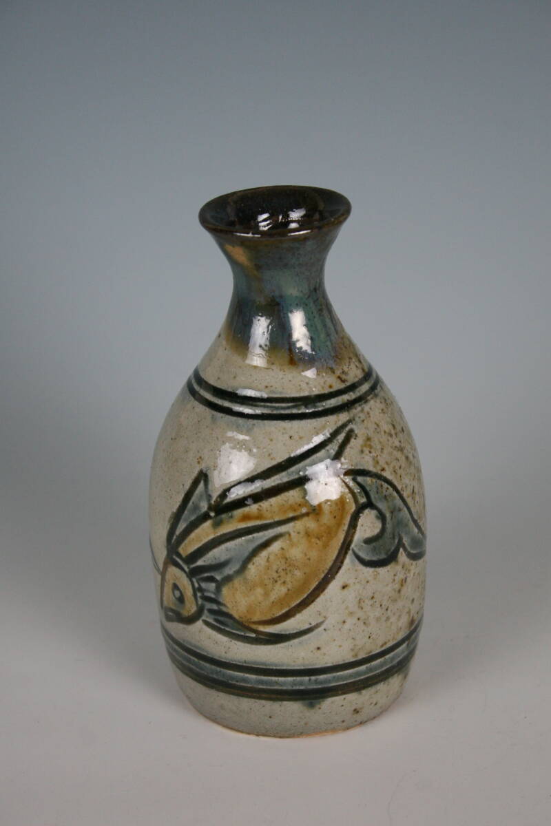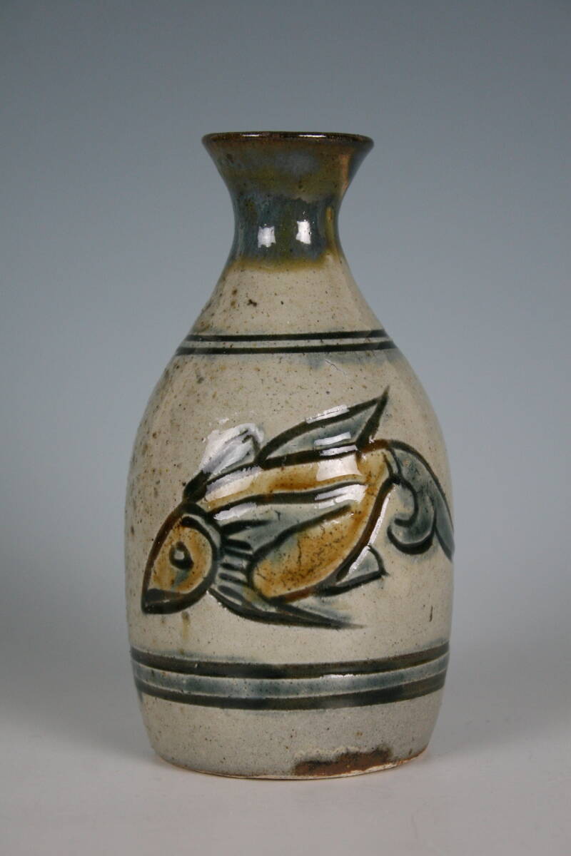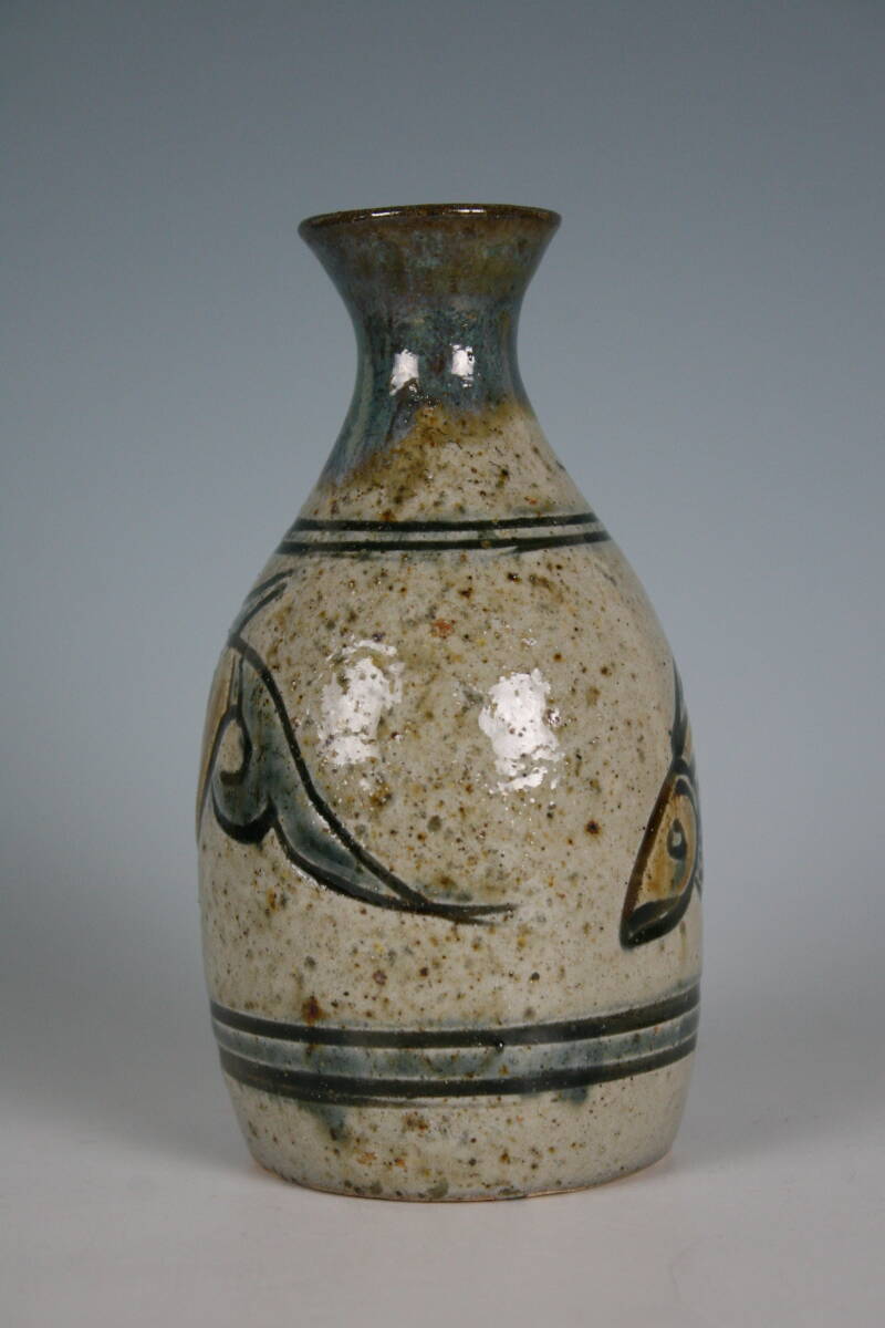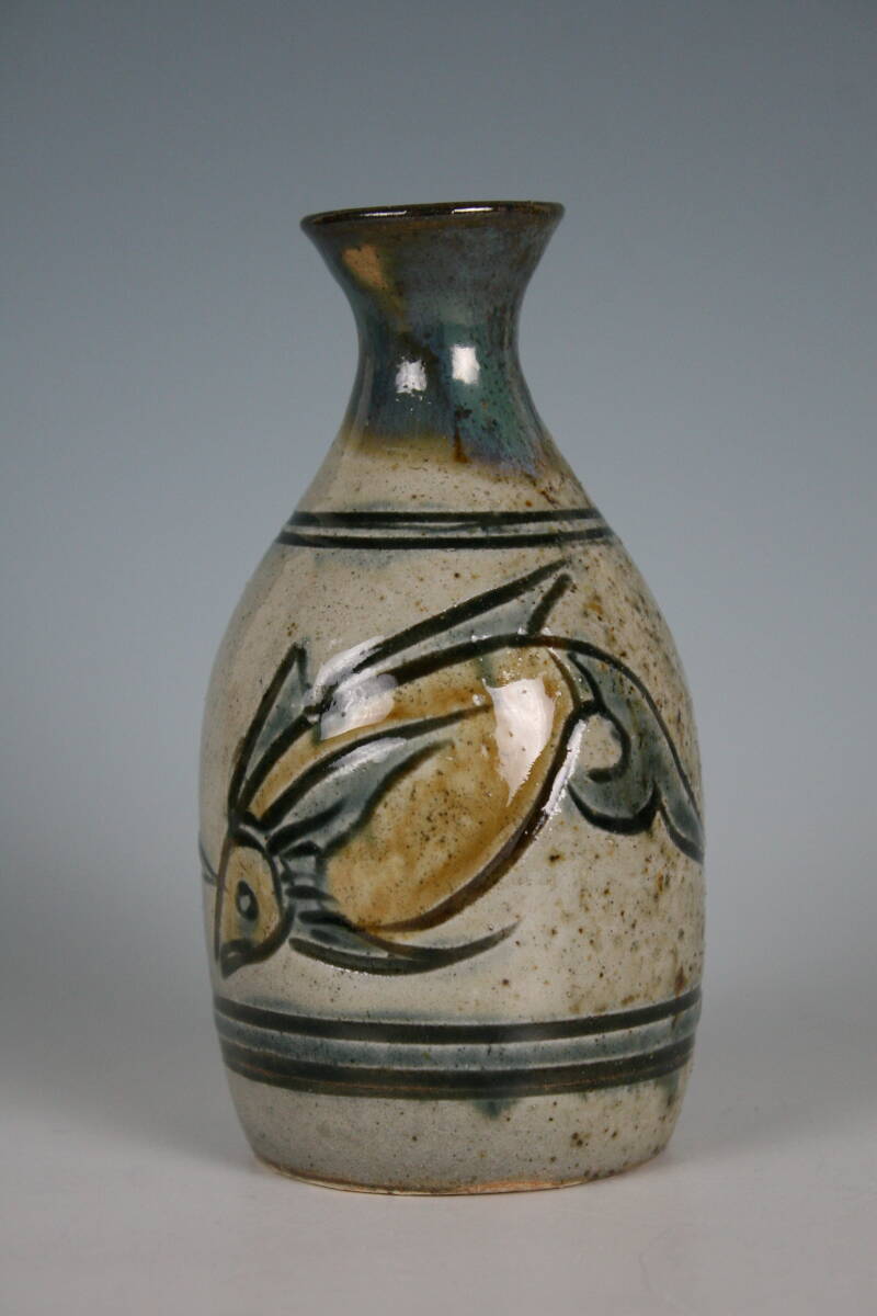 素朴で力強く見事な焼き上がり、次郎先生のまさに代表作と言われる魚文です。勢いある魚文「魚文長徳利」をぜひこの機会にご愛蔵下さい。