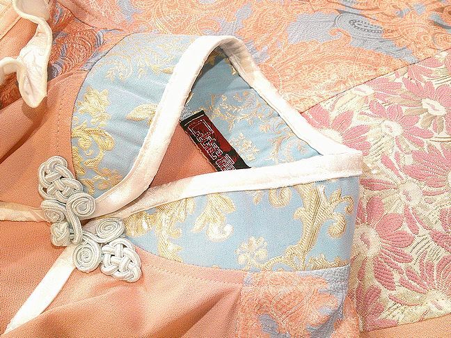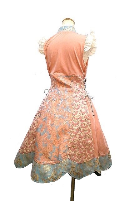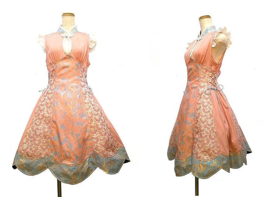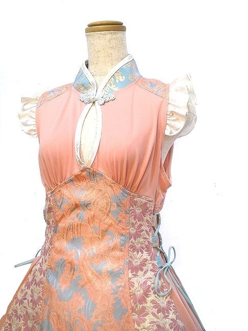 Qutie Frash のチャイナ ワンピース です。かわいいピンクと水色の配色カラーのワンピースで、胸元が開いており、肩のフリルがキュート!両サイドにリボンがレースアップされ、絞って着用いただけます。とてもかわいく珍しいお品ですので是非!サイズは肩幅/約31cm、 身幅/約45cm 着丈/約98cm。状態は若干の使用感程度。15067(70)20250429