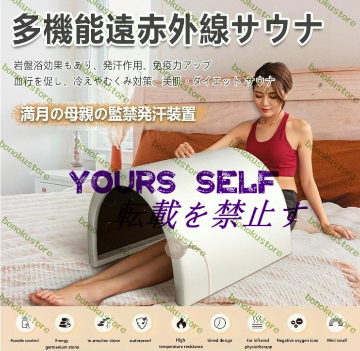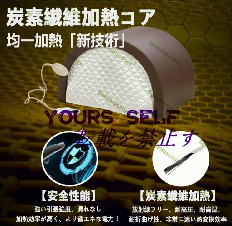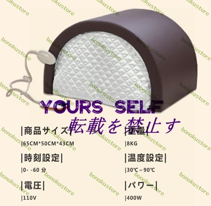 たくさんの展出品の中に弊店の製品をご覧頂き、ありがとうございます。【家庭用サウナ仕様】: ① ホワイト/ブラウン ② 製品サイズ:65CM*50CM*43CM ③ 電圧: 110v ④ 重量: 8 kg ⑤ 最大出力: 400W ⑥ 温度範囲: 30-90℃ (ドームトップ)【遠赤外線温熱パッド-遠赤外線ドームサ
