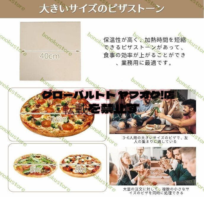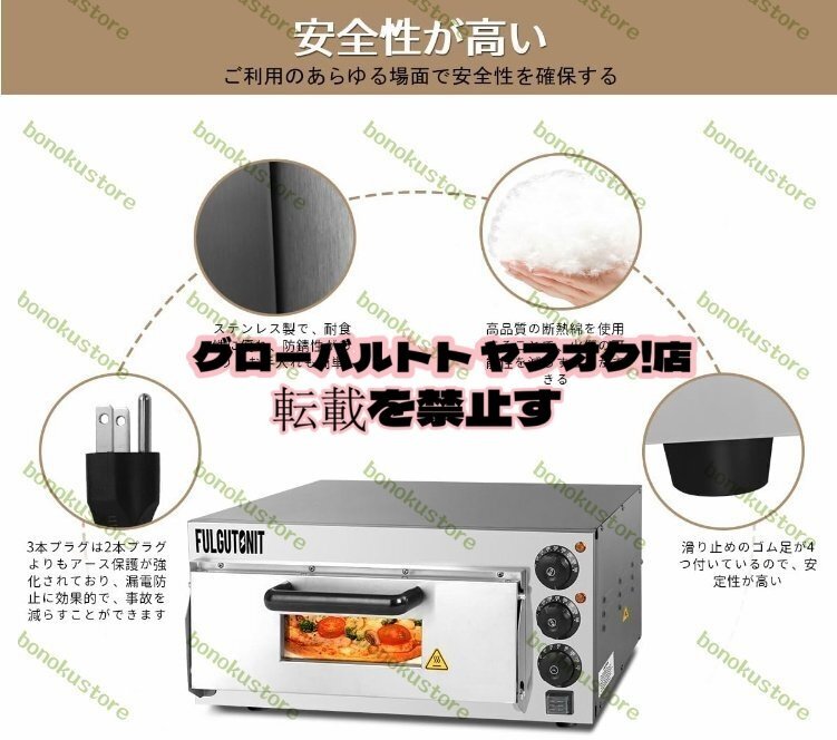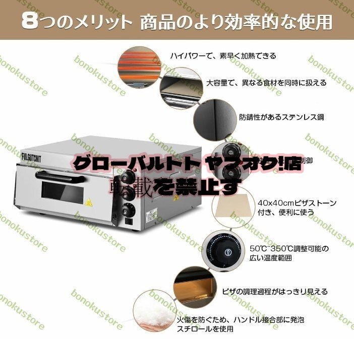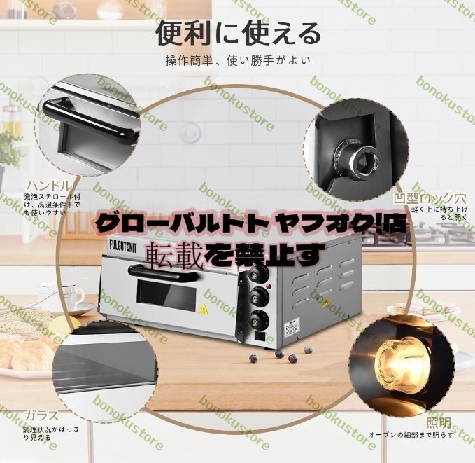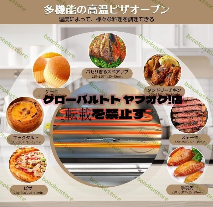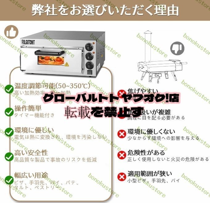 この商品について商品仕様:サイズ:56x50x27.5CM;製品重量:19KG;消費電力:1000W;電圧:100~110V;周波数:50~60Hz;温度調節範囲:120~670(50~350℃);ピザサイズ:約直径40cmまで対応(XLサイズ:16 インチ)。梱包リスト:本体、ピザストーン。独立した温度制御&タ