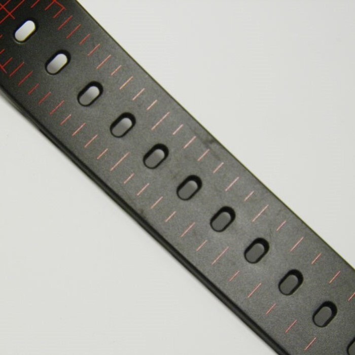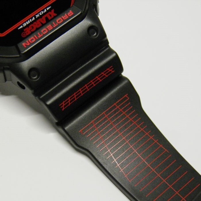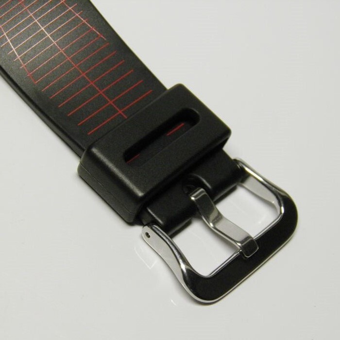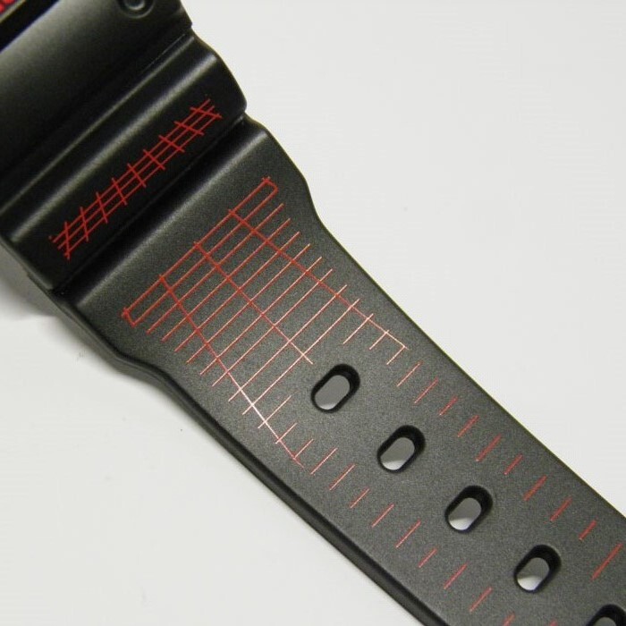 ブラックベースのボディにバンドには、ヴァーミリオンカラーのグリッド柄をデザインし、