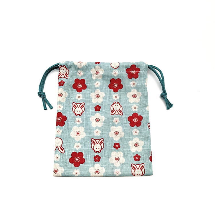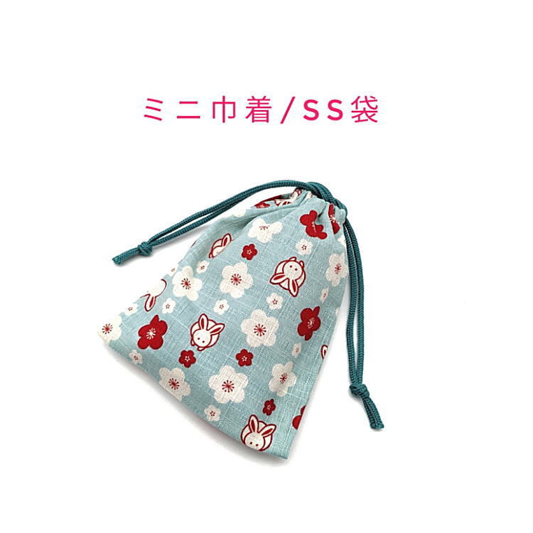 ミニ巾着袋・SS袋【和柄 うさぎ&梅の花柄 ブルー】マチ無し 両絞り 日本製 巾着 ポーチ 小物入れ 和雑貨 海外土産 兎 干支 ウサギ ウメ 花