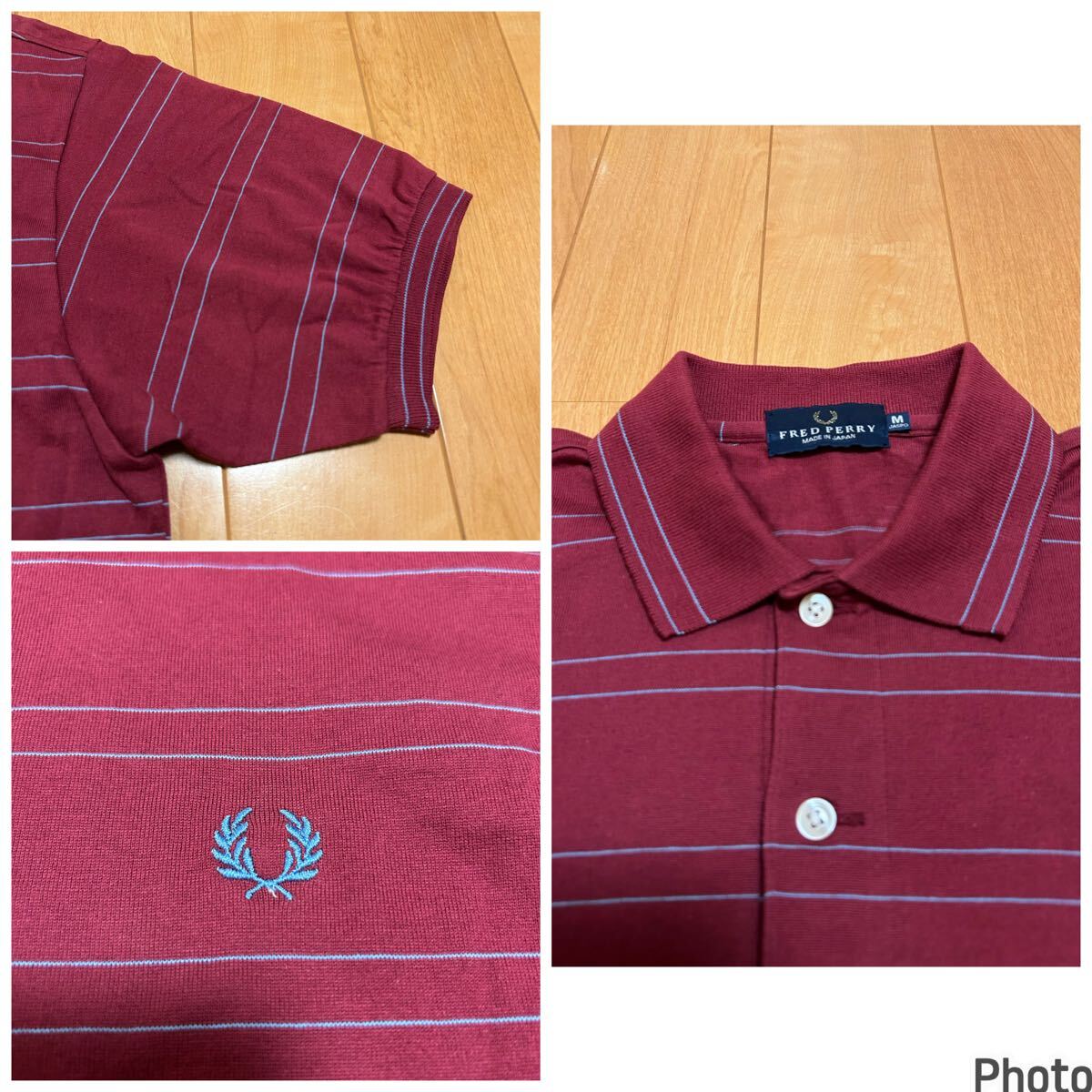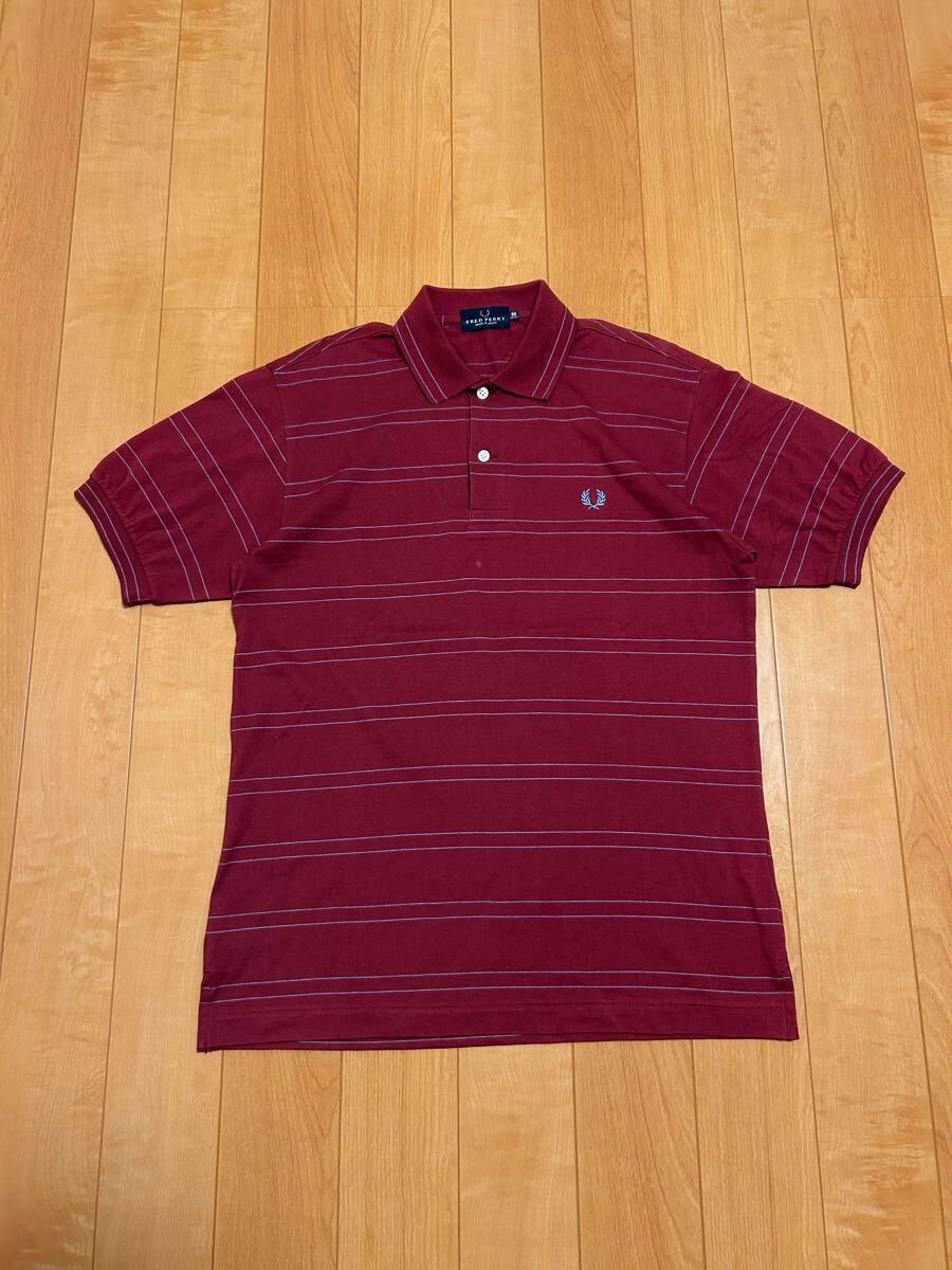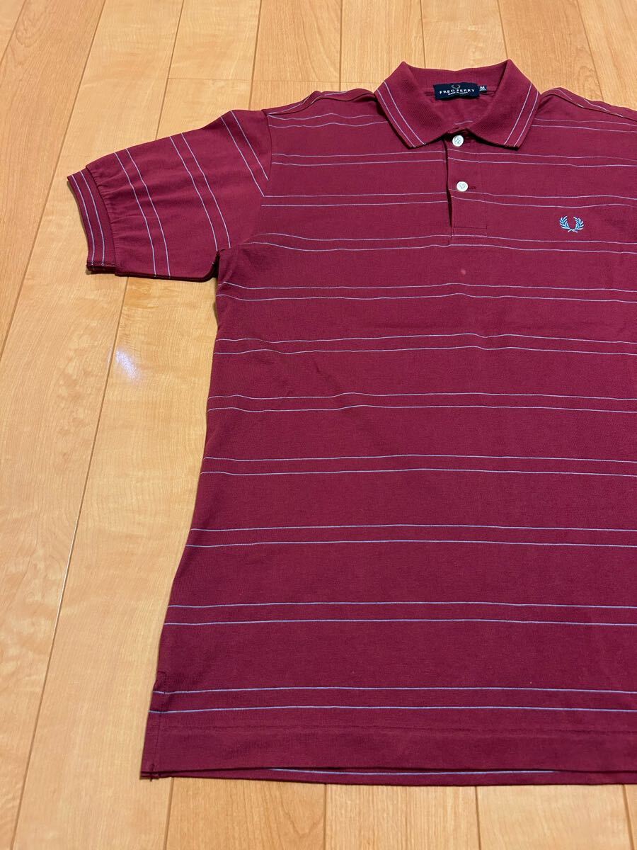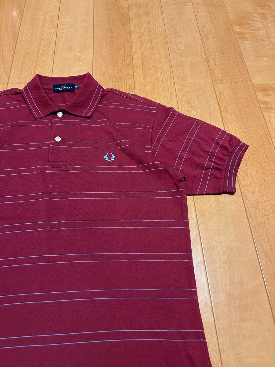 着用少な目.美品☆FRED PERRY/フレッドペリー メンズオーバーサイズM大き目 半袖ボーダー柄.ポロシャツ ロゴ刺繍入・襟&袖口リブライン入