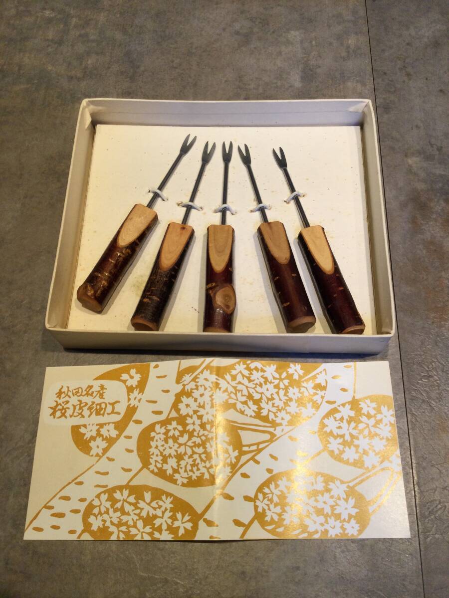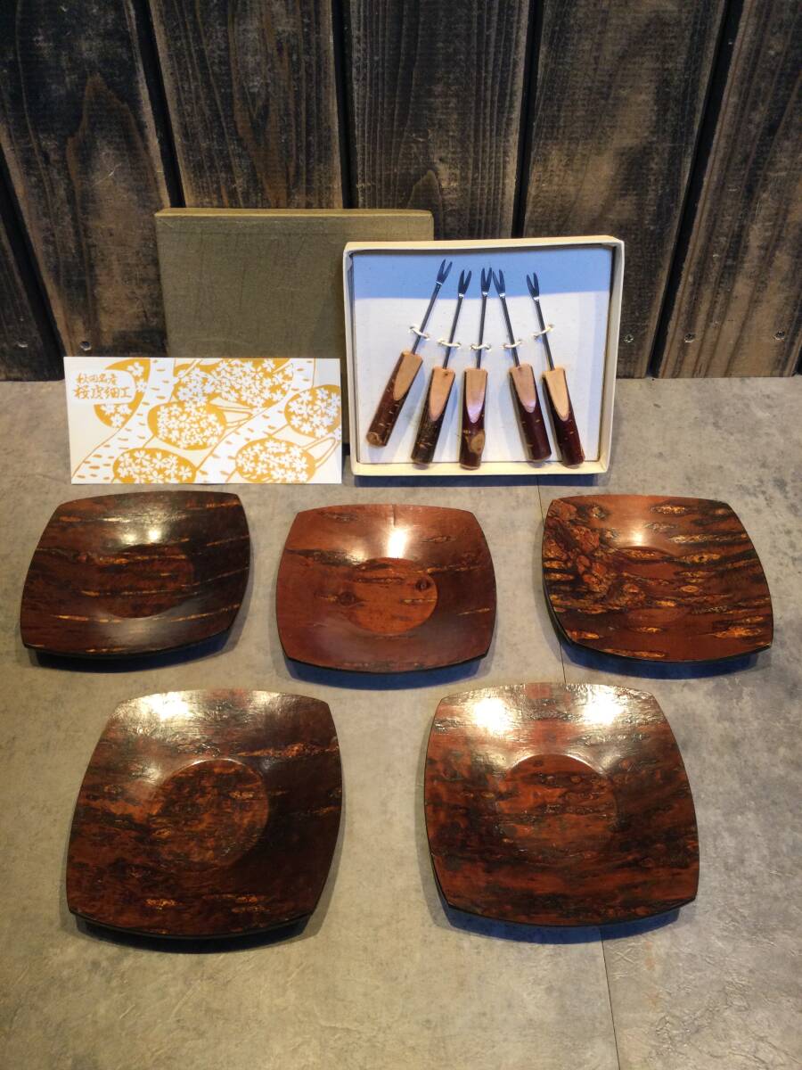 ・ 桜皮細工 茶托(5枚) フォーク(15本)セット秋田 漆器