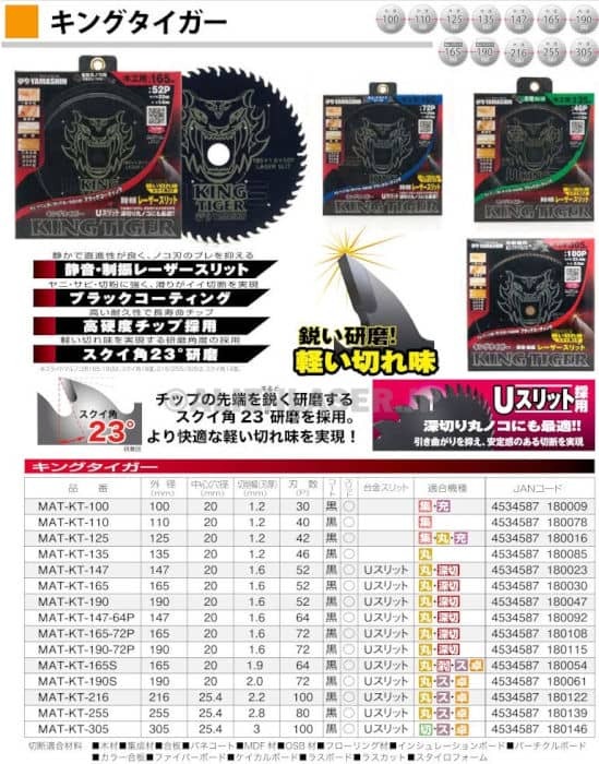 ※モニター(PCモニター・スマホ画面)の発色具合などにより、実際の商品と色が異なる場合がございます。鋭い研磨!軽い切れ味静かで直進性が良く、鋸刃のブレを抑える静音・制振レーザースリット採用! ヤニ・サビ・切粉に強く、滑りがいい切断を実現する、ブラックコーティング!高い耐久性で長寿命チップの高硬度チップ採用! チップの先端を鋭く研磨するスクイ角23°研磨採用。より軽快な軽い切れ味を実現! Uスリット採用! 引き曲りを抑え、安定感のある切断を実現。深切り丸鋸にも最適!!MAT-KT-110外径110mm中心穴径20mm切削幅(刃厚)1.2mm刃数40Pコート黒スリット○適合機種集じんマルノコ・充電マルノコ※モニターの発色具合により、実際のものと色が異なる場合がございます。