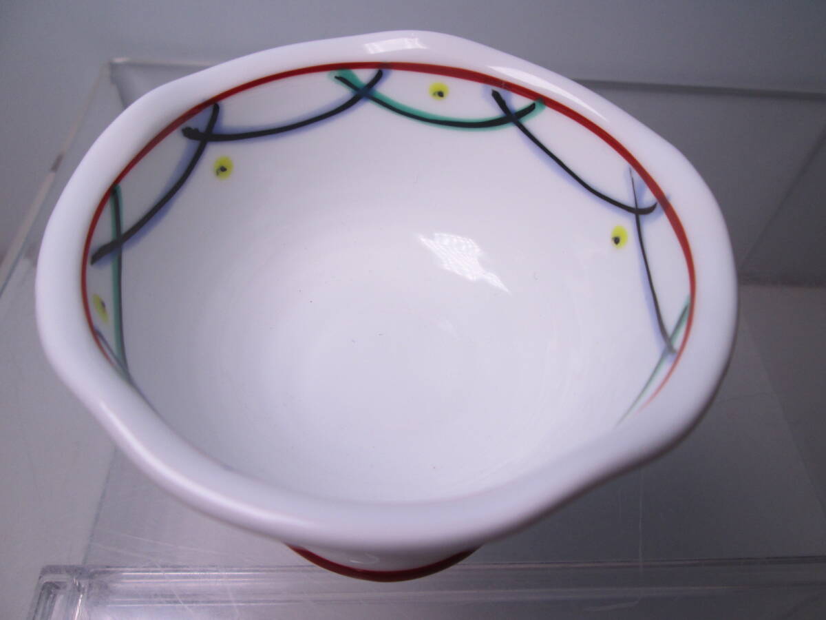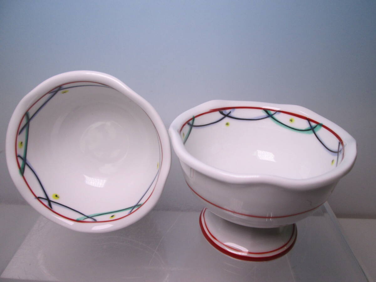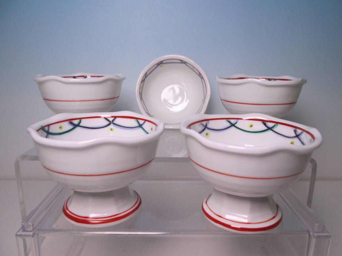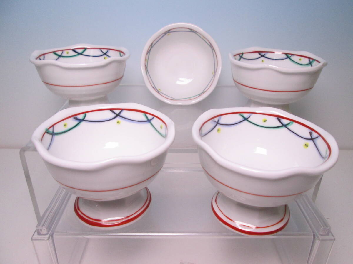 ☆お料理屋さんの器 在銘 色絵 輪花形 高杯向付 五客 箱無し デザート小鉢/懐石/割烹/日本料理