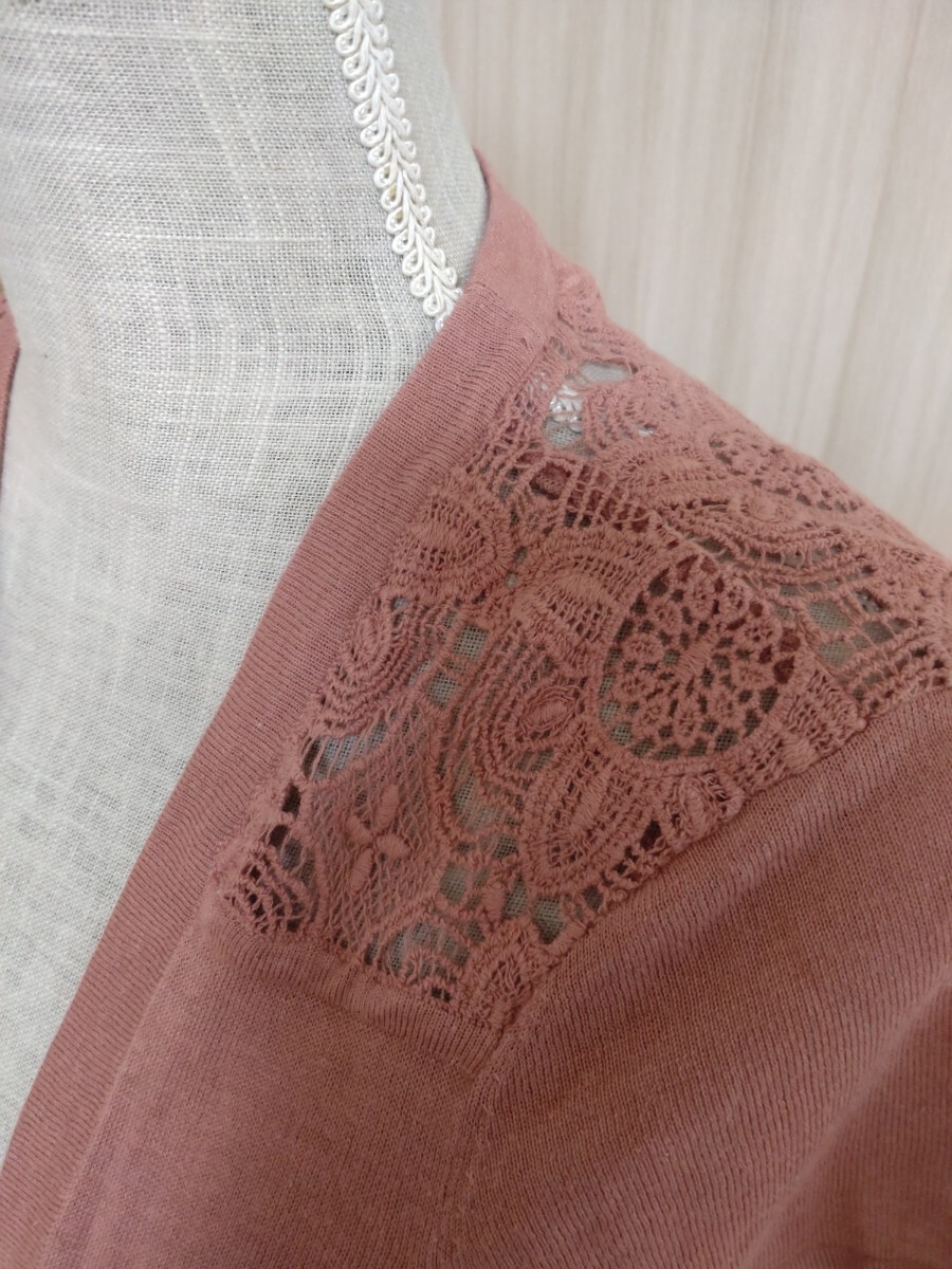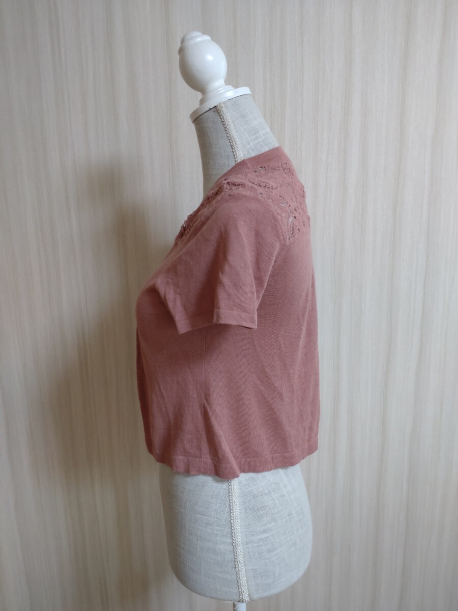 肩のレースがエレガントで淡い落ち着いたピンクのお色です。