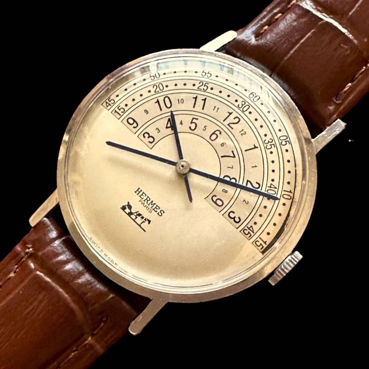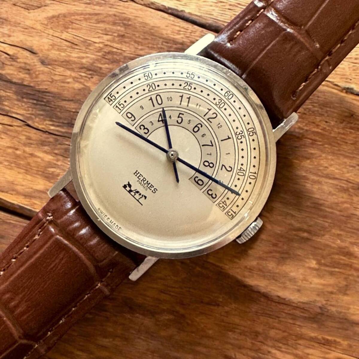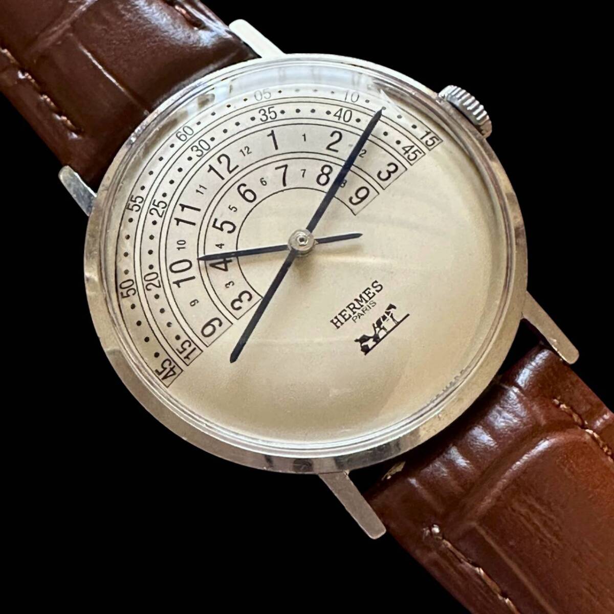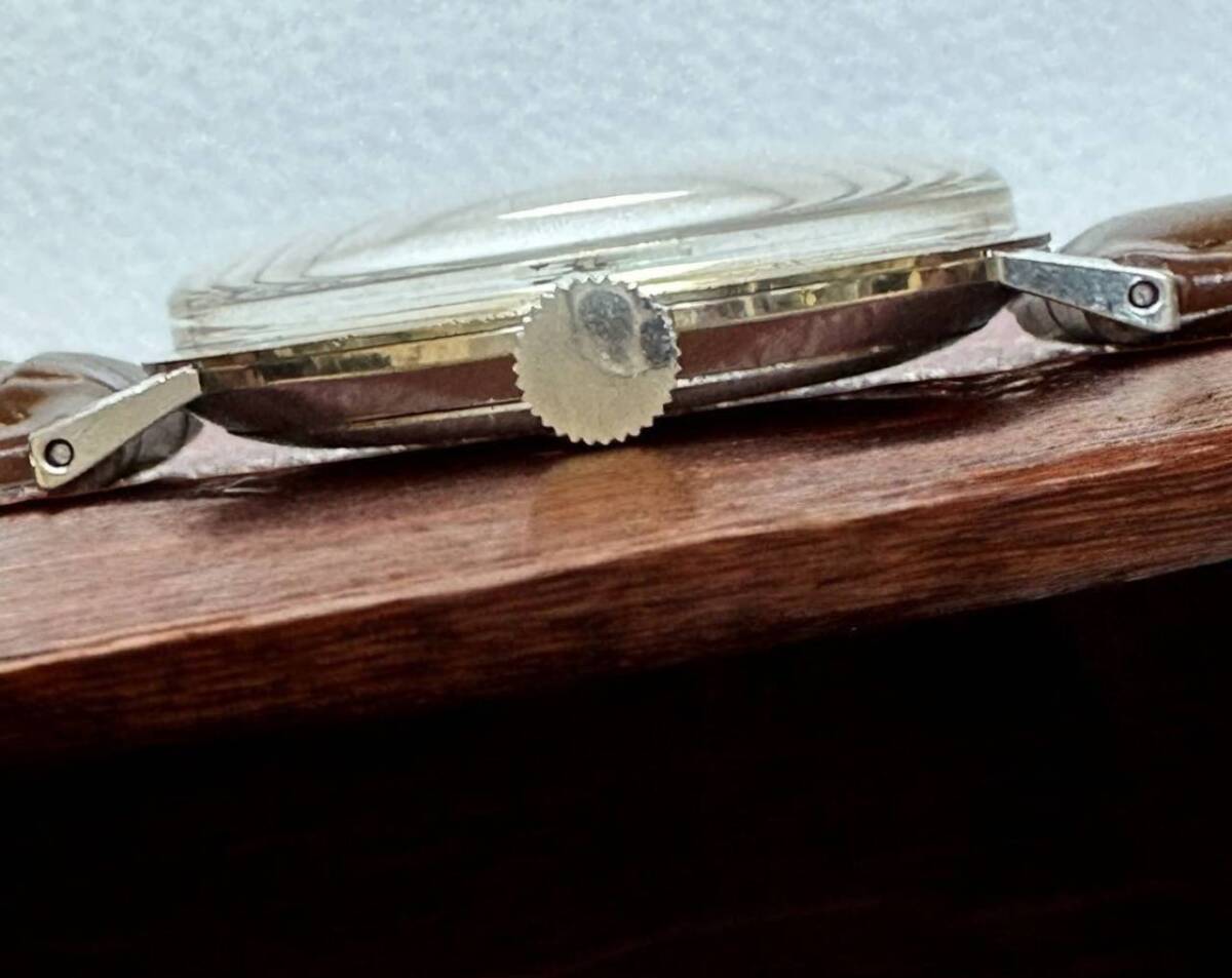 ご覧いただきまして、誠にありがとうございます。 【サイズ等】 ケース:約33.9mm(リューズを除く) ラグ幅: 約17.5mm ムーブメント:手巻き 年代:20世紀半ば頃 【特徴】 ①1枚目の時間は10時12分です。 ②1930年代頃から、『わざと文字盤が読みづらい時計』が流行しました。先進的なデザインが与えられ、人気を博しました。コレクターズアイテムとして現在でも人気があります。 【その他】 ※立体物のため、計測上の誤差はあり得ます。 ※ベルトと尾錠は社外品です(お好みに合わせて交換を前提としております)。 ※色合いを完全に再現することが困難です。ご了承ください。 ※アンティーク時計特有のスレ傷や汚れなどがあります。全てを写真に撮影することは困難であり、ご了承ください。 ※日差は5分以内とお考え下さい。手巻きのアンティーク時計の場合、姿勢や環境、リューズの巻き上げ具合によって異なります。 |