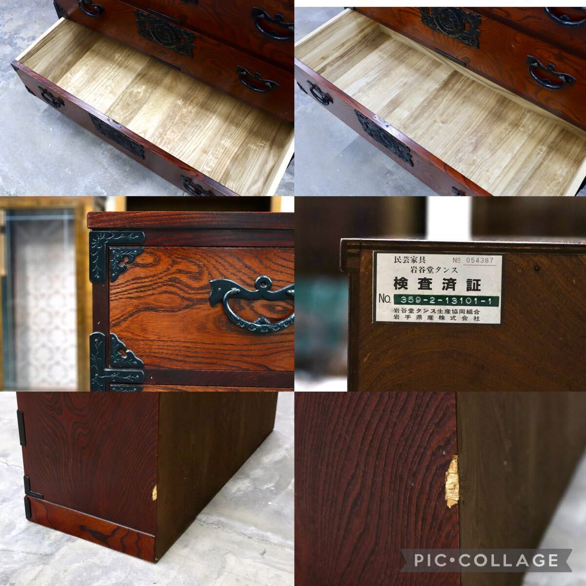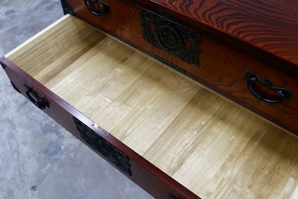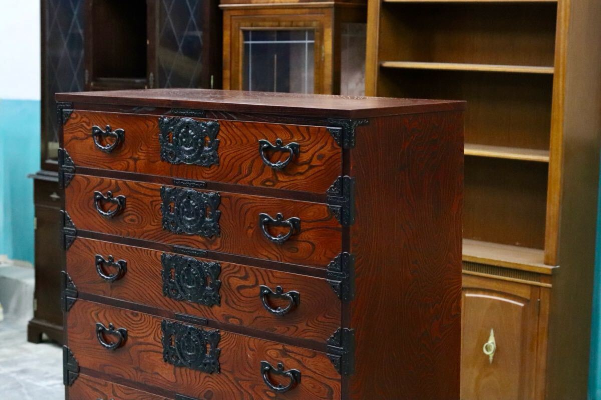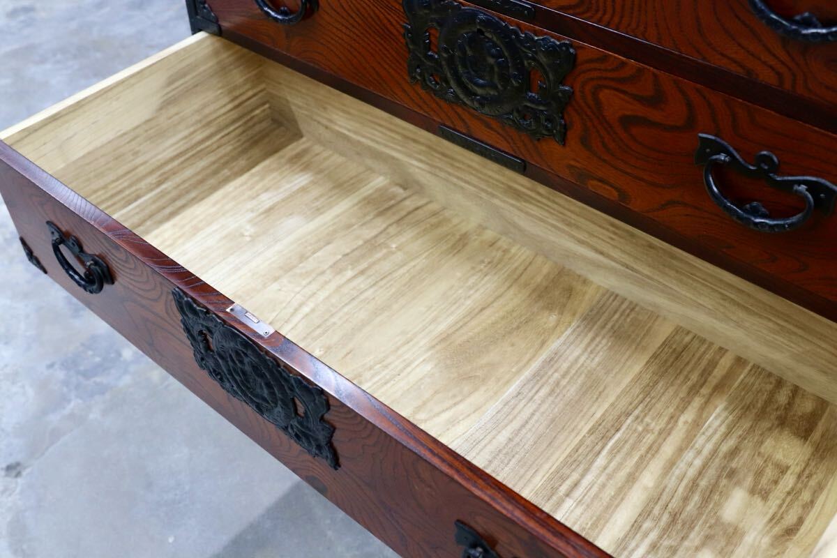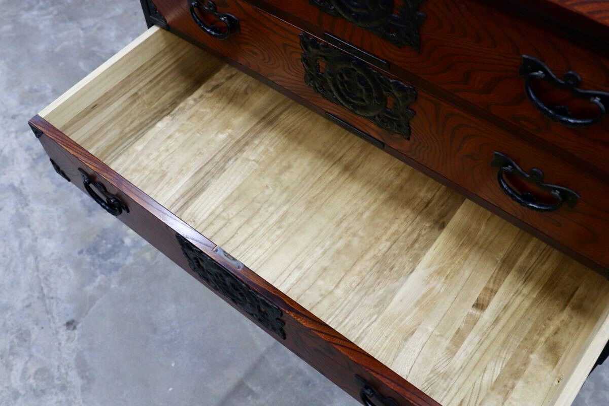 岩谷堂箪笥の起源は、康和年間(1100年代)藤原清衡が産業奨励に力を注いだ時代にさかのぼります。その後天明時代(1780年代)に岩谷堂城主岩城村将が車付の箪笥を作らせ、更に文政年間(1820年代)に徳兵衛という鍛冶職人が彫金金具を考案しました。最初は桐の模様が多かったのですが、次第に虎に竹、龍花鳥など多くのデザインが開発されました。その技術が今でも引き継がれています。昭和57年には伝統的工芸品に指定され、これからも時を越えて受け継がれていくみちのくの伝統です。