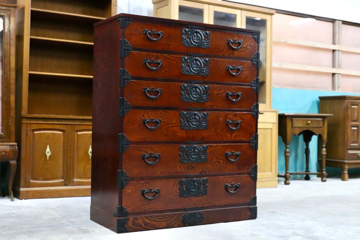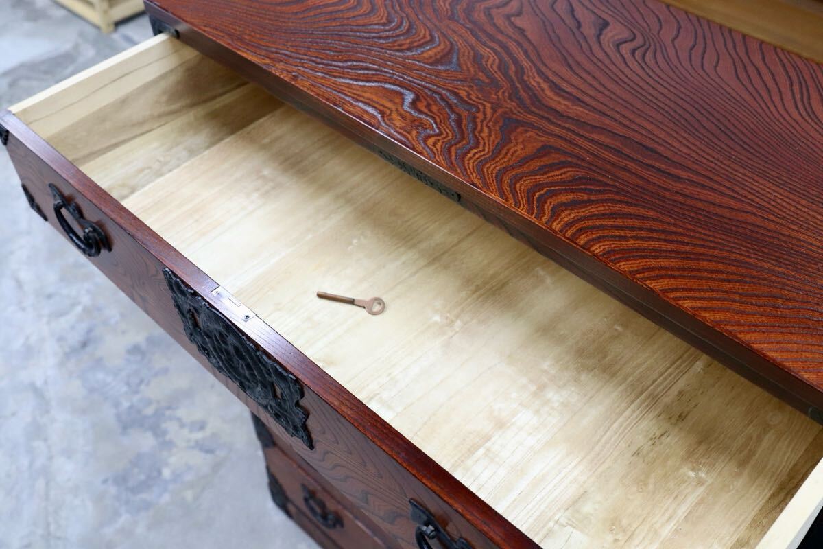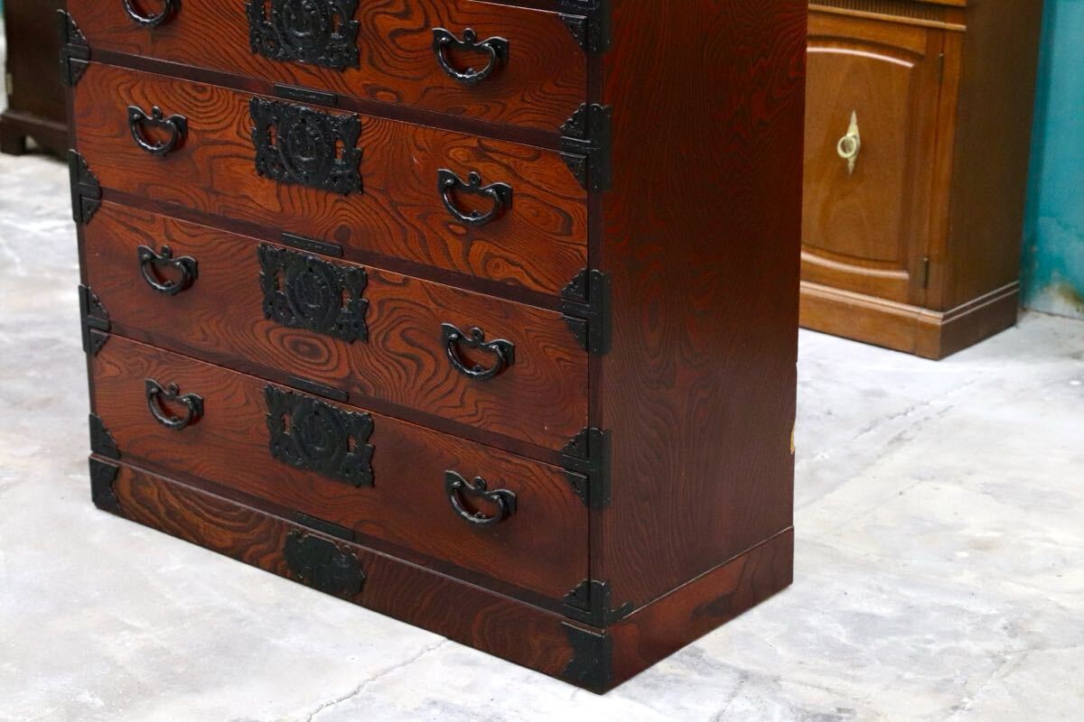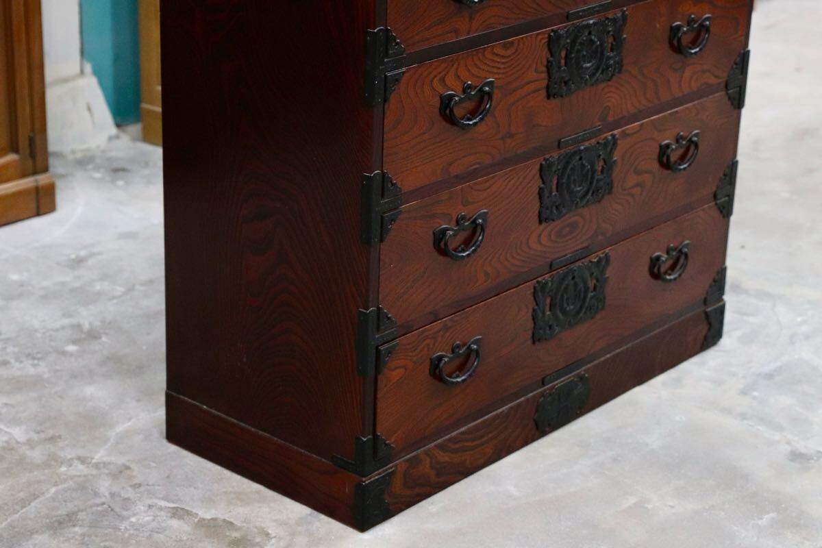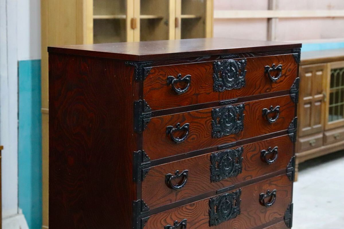 岩谷堂箪笥の起源は、康和年間(1100年代)藤原清衡が産業奨励に力を注いだ時代にさかのぼります。その後天明時代(1780年代)に岩谷堂城主岩城村将が車付の箪笥を作らせ、更に文政年間(1820年代)に徳兵衛という鍛冶職人が彫金金具を考案しました。最初は桐の模様が多かったのですが、次第に虎に竹、龍花鳥など多くのデザインが開発されました。その技術が今でも引き継がれています。昭和57年には伝統的工芸品に指定され、これからも時を越えて受け継がれていくみちのくの伝統です。