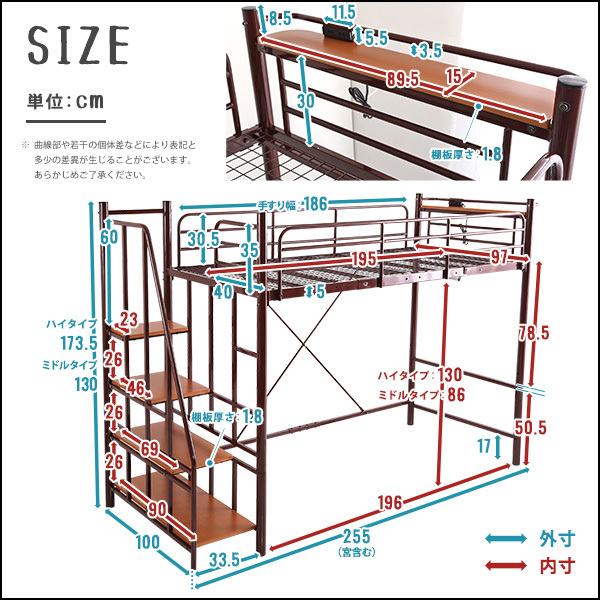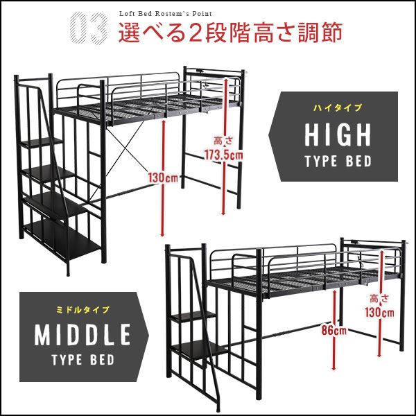 階段付パイプロフトベッド(6色)、ハイタイプでもミドルタイプでも選べる大容量の収納力 | Rostem-ロステム-