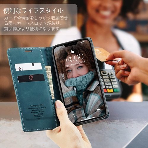 【機能性 4in 1】①横置きスタンド機能:動画視聴でも手に持つ必要がなく、超楽々動画視聴が可能です;②財布型:ケースの裏側に二つのカードポケットとお札入れのフリーポケット一つあり、ショップでのポイントカード、交通機関でのスムーズな移動をサポートでき、 SUICA / PASMO / ポイントカード / メモ 等収納でき、ちょっととしたお出かけてもこれで十分です;③留め具なし、マグネット内蔵 ベルトなし、片手でも簡単操作できる;④ストラップホールはTPUケースの右下にあり、お好きなストラップを使用し、生活にもっと便利になり、または各種ボタンの使用、カメラ撮影、スピーカーホール等、すべての機能もそのまま立て掛けて稼働します;