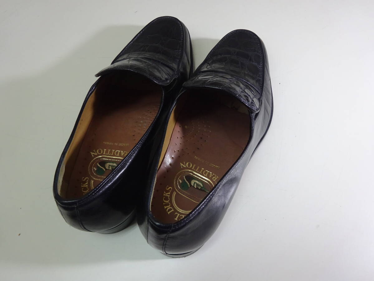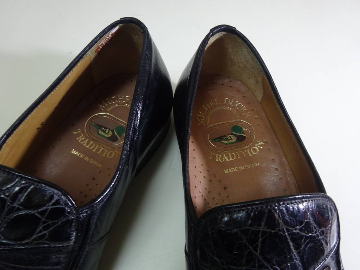 MICHEL DUCKS メンズ クロコダイル ローファー スペイン製品 商品説明 ●サイズ39 日本サイズ24cm〜24.5cm相当 ●アウトソール約27.5cm ●ワイズ幅約9.8cm ●状態 やや使用感は御座いますが比較的使用回数が少なくアッパーにクロコダイル皮革を使用した高級モデルに。なります。 ●お色 ブラック革/アッパーはクロコダイル皮革 ●お手入れ抗菌済み品 ●箱無し コメントが御座いますとお気軽にお問い合わせ下さいね、 宜しくお願い致します。