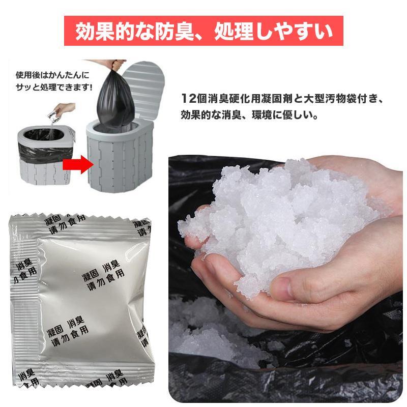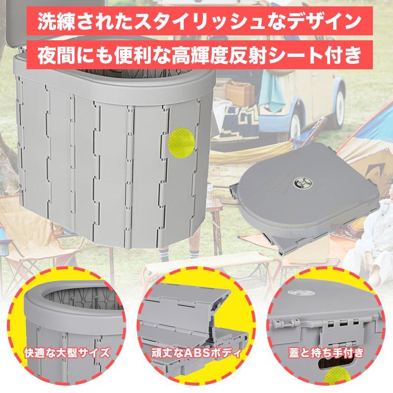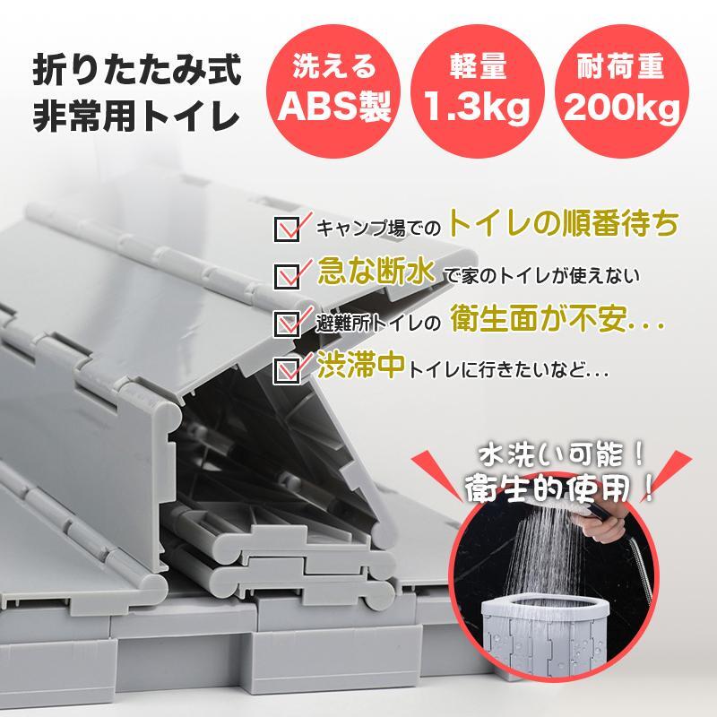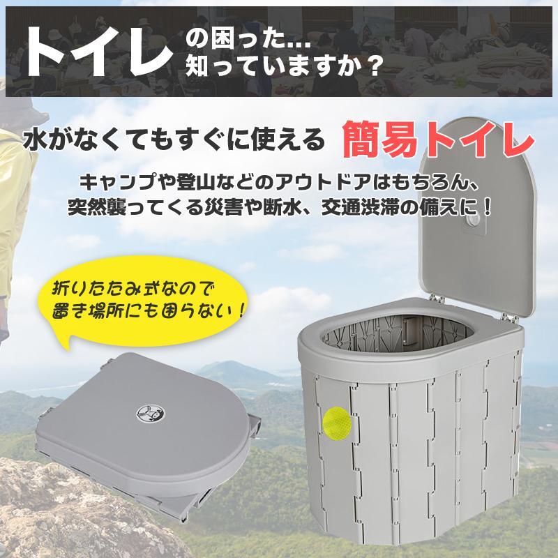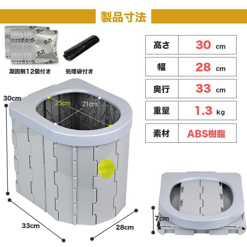 ◆商品詳細◆ 水も電気もいらない非常用折りたたみ式トイレ。 高輝度反射シールで夜中でも安心トイレできます。 ■渋滞・登山・介護など様々な場面に! ■災害に備えて長期保存可能! ■突然襲ってくる災害や断水、交通渋滞の備えに! ■人間工学に基づいたデザインで座りやすい! ■蓋と底板付きなので、臭い漏れを防ぎます! ■水洗い可能なので、いつでも清潔綺麗に使用可能! ■車中のごみ箱として使用も可能。 ■ビニール袋15枚+15枚 ■凝固剤12個付き+12個 ■トイレ2個 【耐荷重】:約200kg 【重量】:約1.5kg 【本体サイズ】:(約)33cm×30cm×28cm。