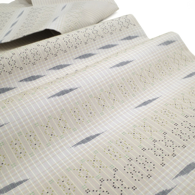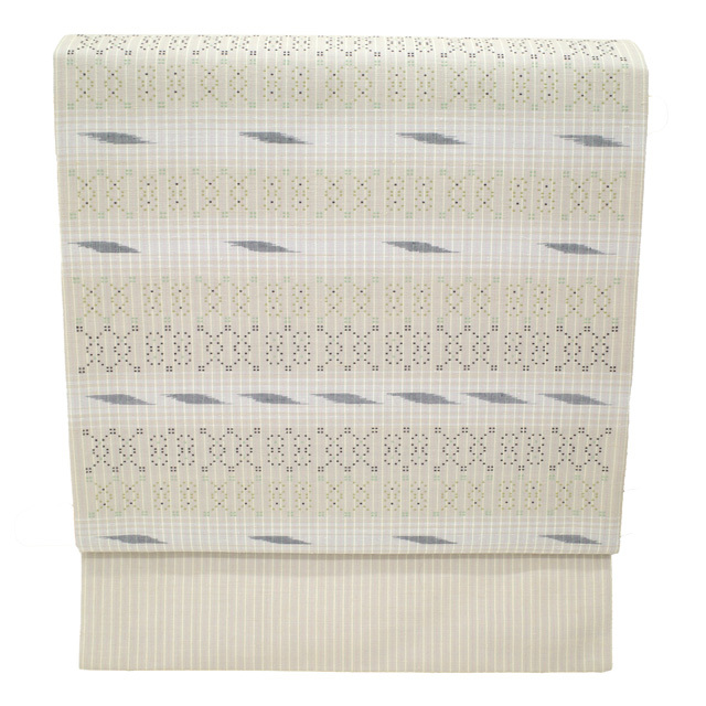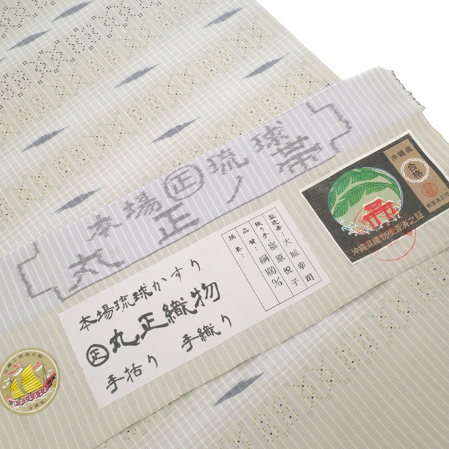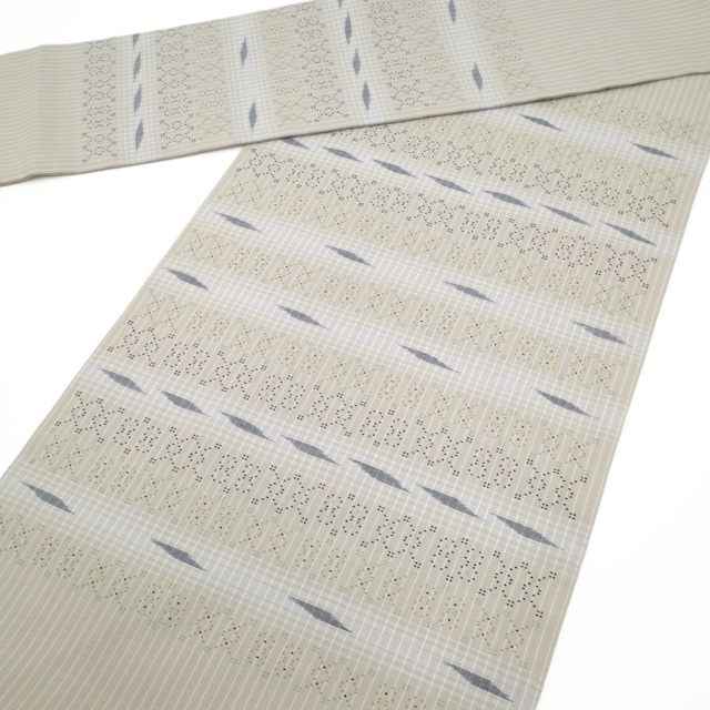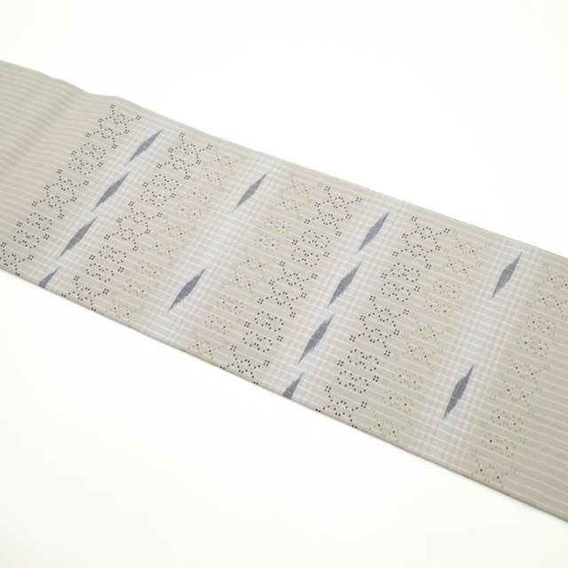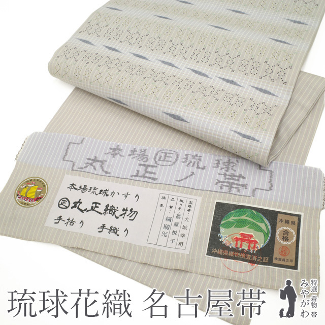 名古屋帯 九寸 本場琉球かすり 沖縄県 丸正織物 花織 ライトグレー地 手織り 手括り カジュアル 新古品 仕立て上がり みやがわ sbs54044